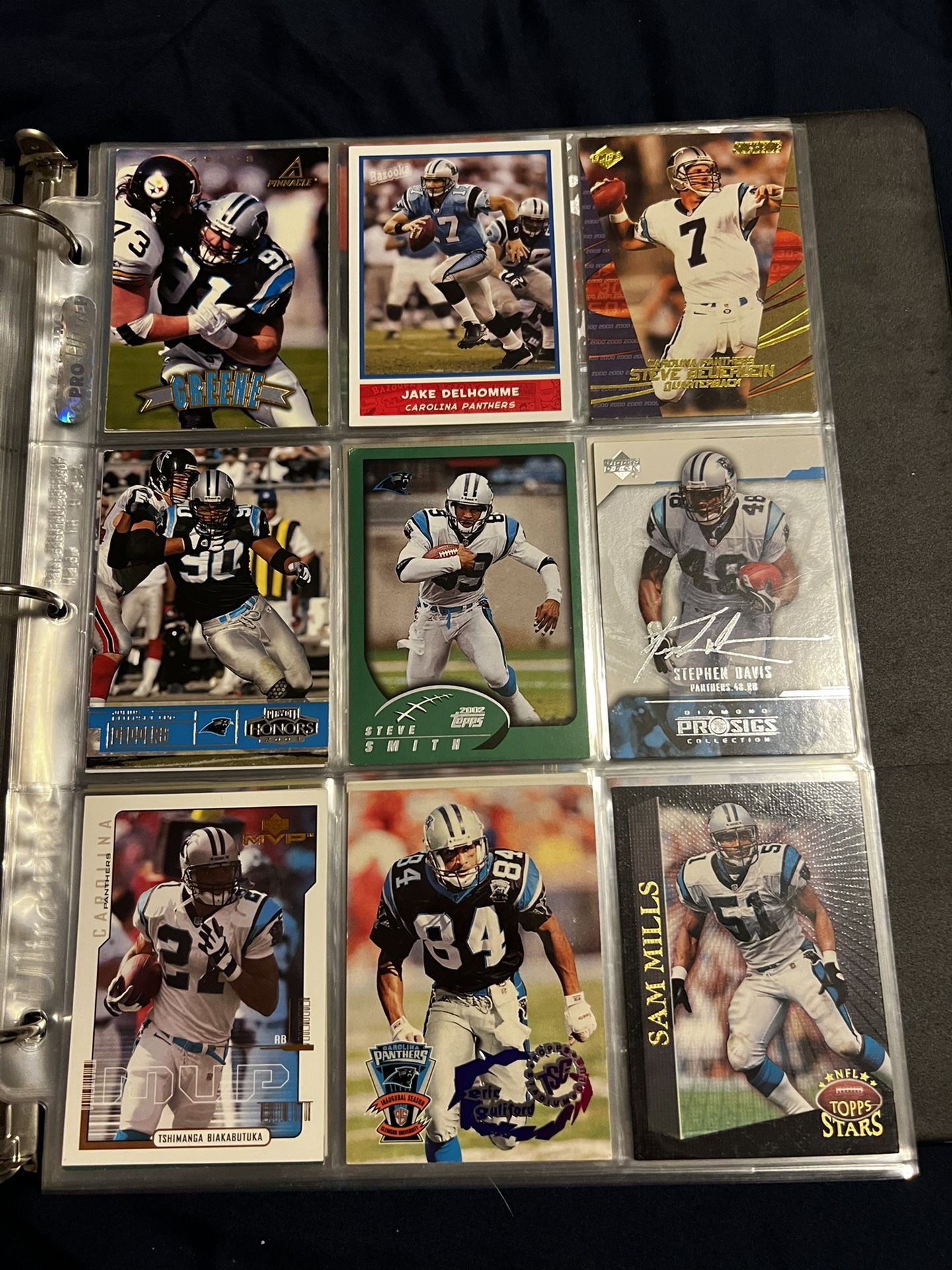 252 Carolina panthers football cards in a 3 ring binder Stephen Davis, Sam mills, Fred lane, Jake delhomme, Julius peppers, Steve smith, Kevin greene, Kerry collins and many more Not sure of a price make offer