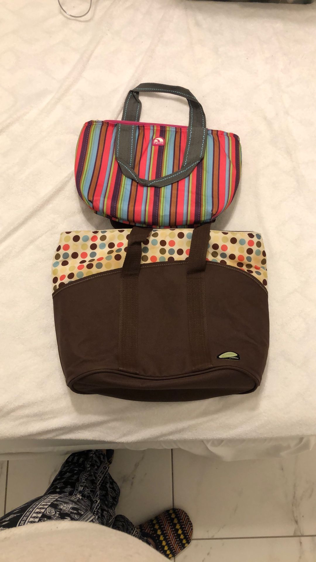 Small stripped Igloo lunch bag Big brown and polka dots lunch bag Both insulated Both have handles