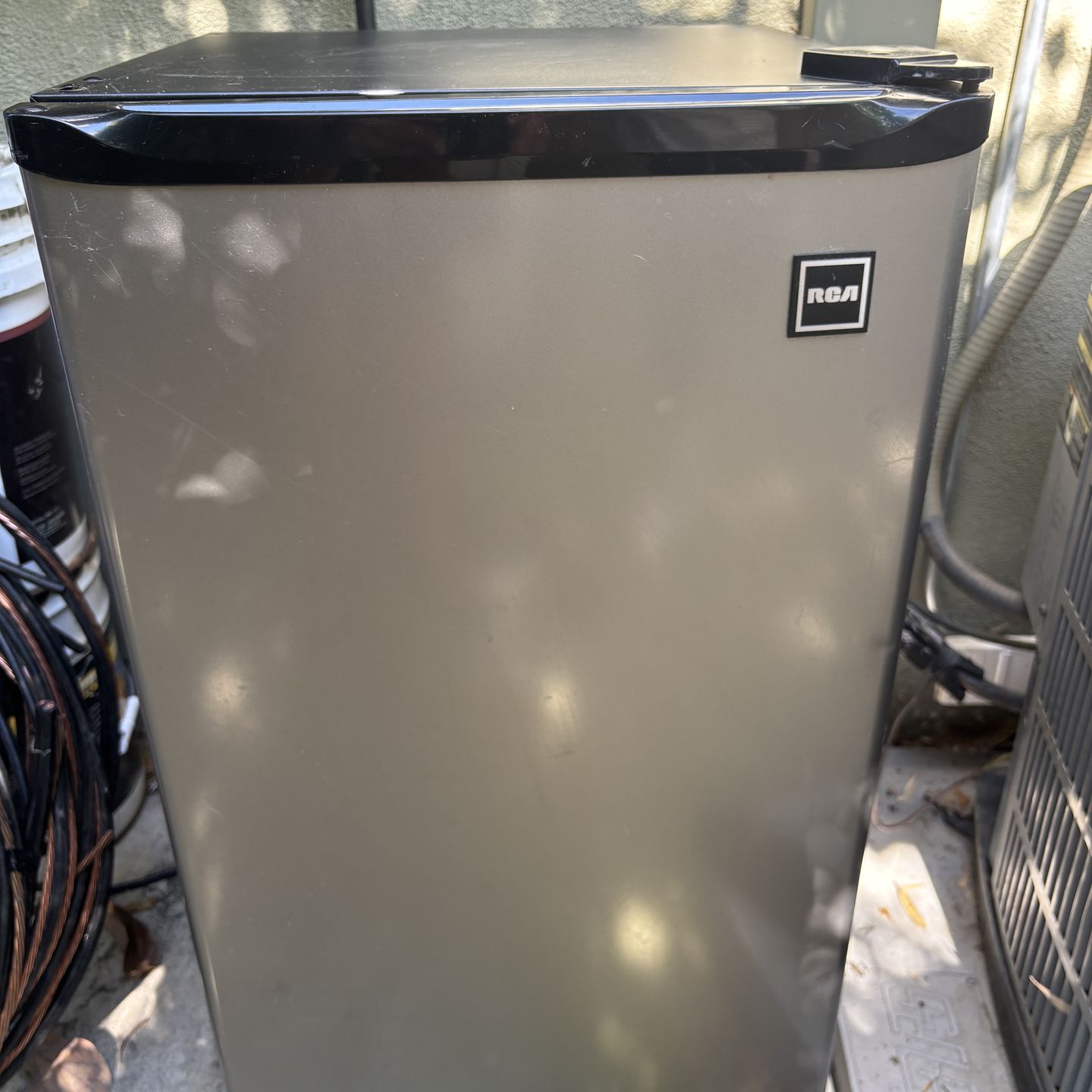 RCA 4.5 CU FT MINI FRIDGE IN BLACK W/ STAINLESS STEEL DOOR & TOP DRAWER FREEZER. Dimensions: H31.5” X W17.5” X D18.5”