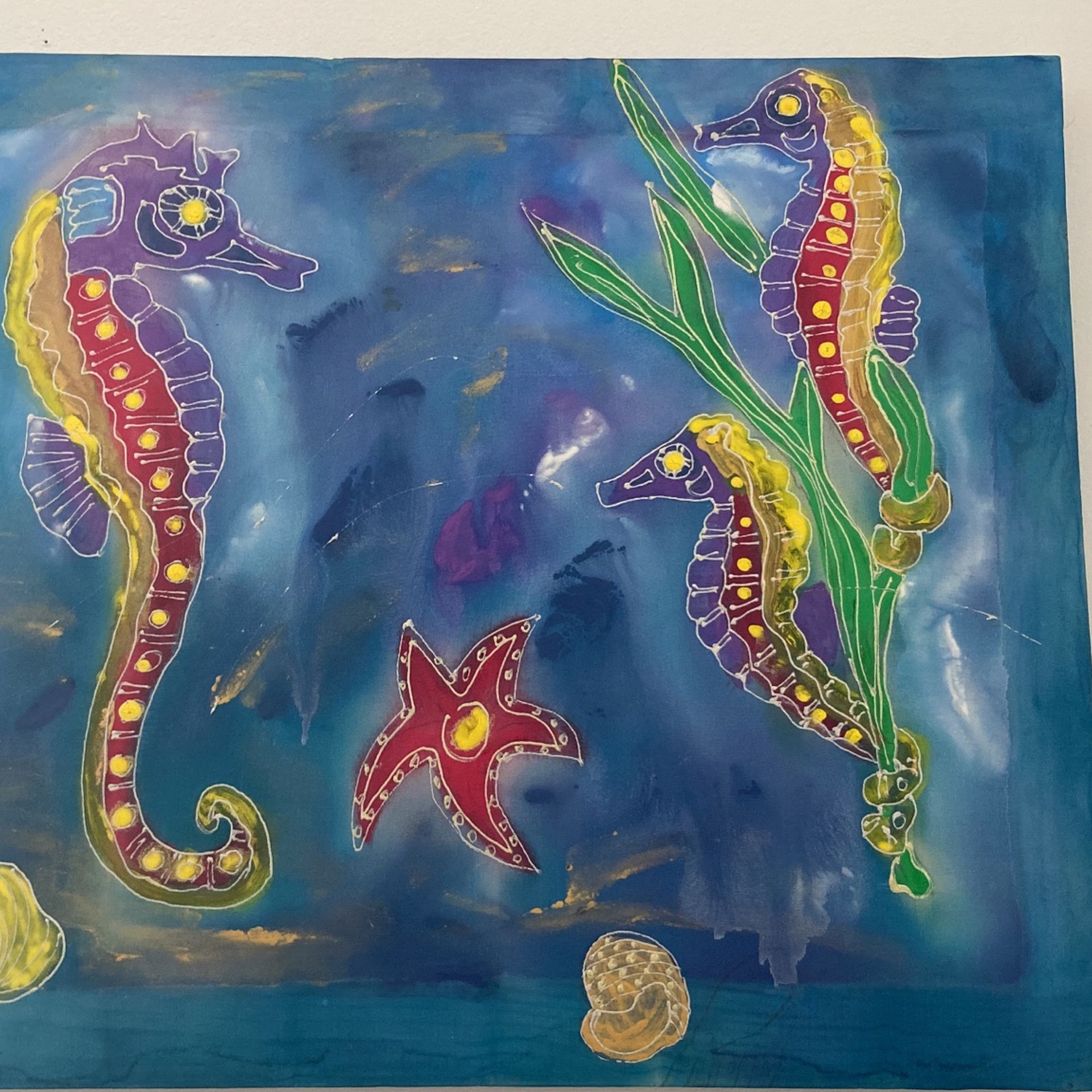 Handmade painting over silk fabric. 19 5/8” x 15 5/8”