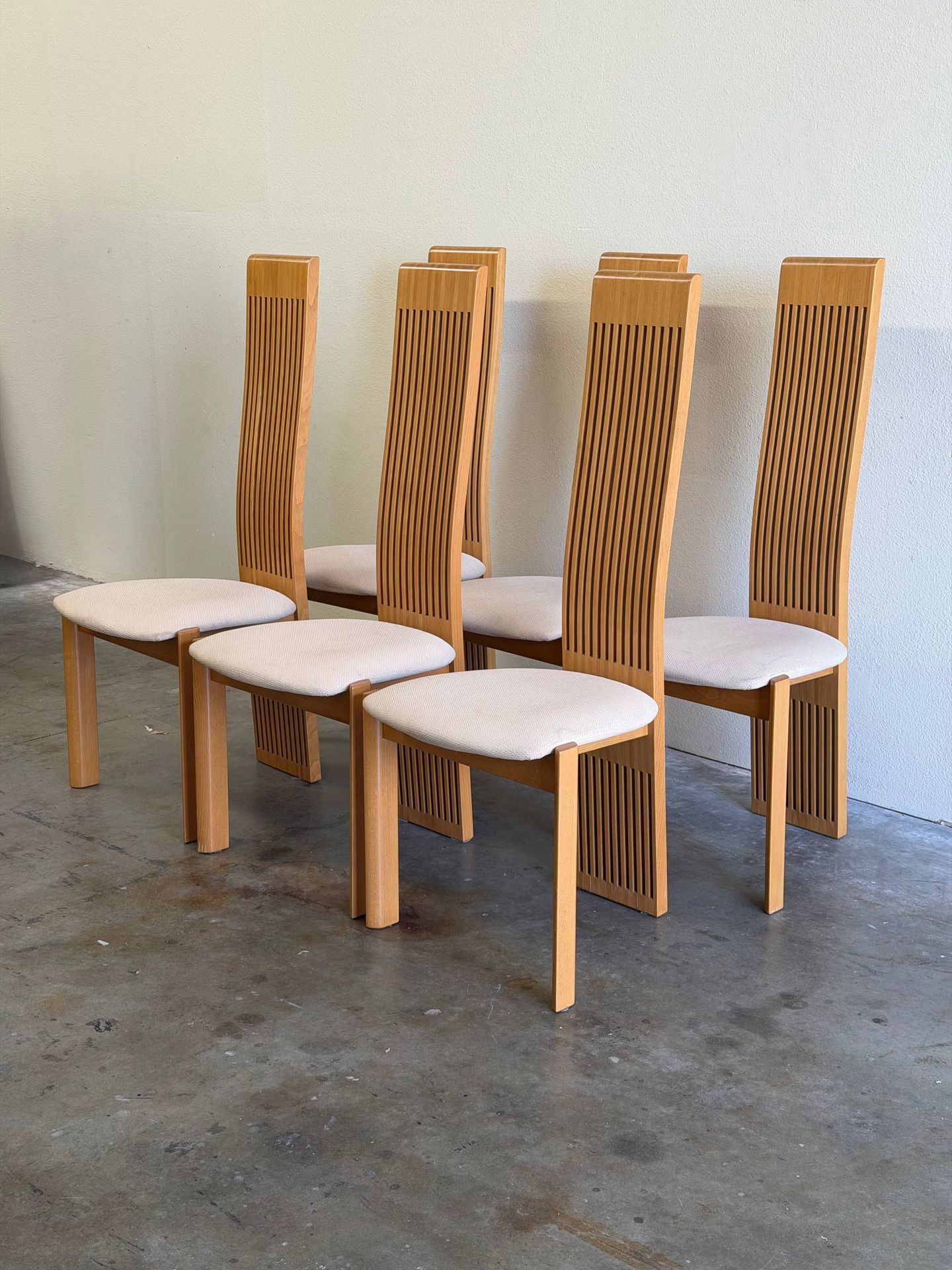 π Delivery is available for extra fee These striking chairs feature very tall architectural slatted backs that create a dramatic vertical presence while maintaining an elegant and minimal profile. The light wood frames pair beautifully with neutral upholstered seats, making them versatile for both modern and contemporary interiors. The distinctive slatted back design adds texture and depth while remaining visually light, a signature element often seen in Italian late-modern furniture design. Dimensions (each): 19.5β W Γ 19β D Γ 47β H Seat height: 19β Seat depth: 18β Very good vintage condition with light wear consistent with age. Optional: Two additional matching chairs are available featuring darker wood frames with black upholstery. These can be added to the set for $800 extra.