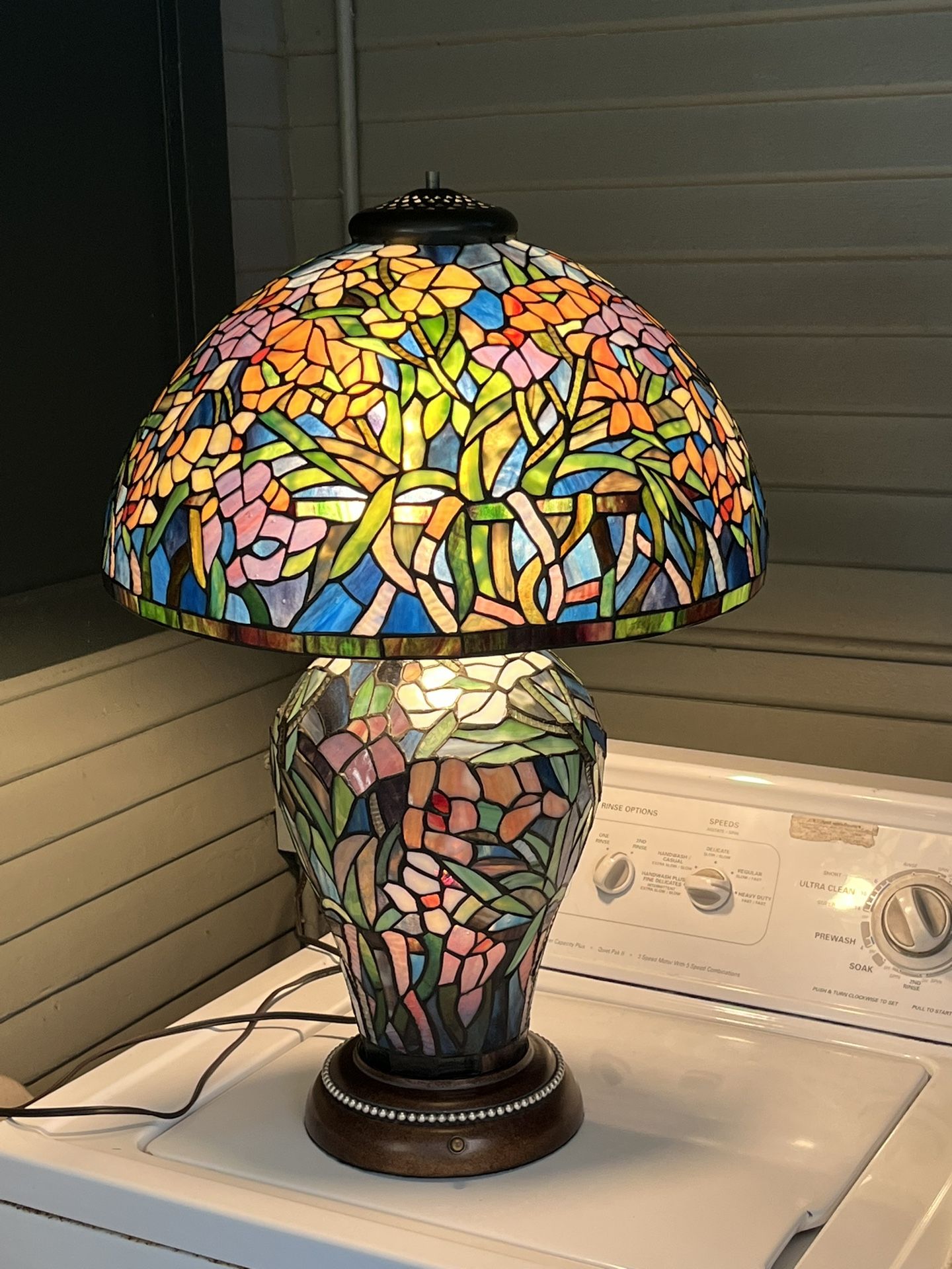 Beautiful large stained glass lamp. No cracks. It is missing the finial to screw shade down. Easy replacement. You can like just the top, bottom or both. Cash only, no money apps. Absolutely firm on price.