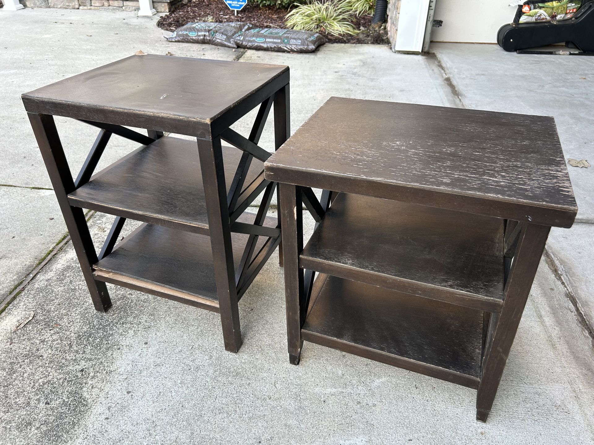 Set of 2 Dark Wood End Tables Pair of dark espresso wood end tables. Similar style with X-brace detail and two shelves each. Solid and sturdy. Some wear on the tops as shown in photos. $50 for both / $25 each. Taller table is 24” tall, 15x17” table top. Shorter table is 21” tall, 15x19” table top.