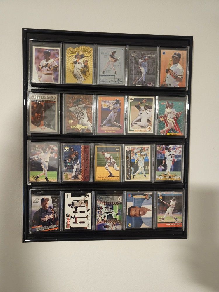 Hello, selling my childhood Barry Bonds card collection in a nice black frame for trading cards. All cards are year 2000 and older. Don't know exact value but there worth something good.