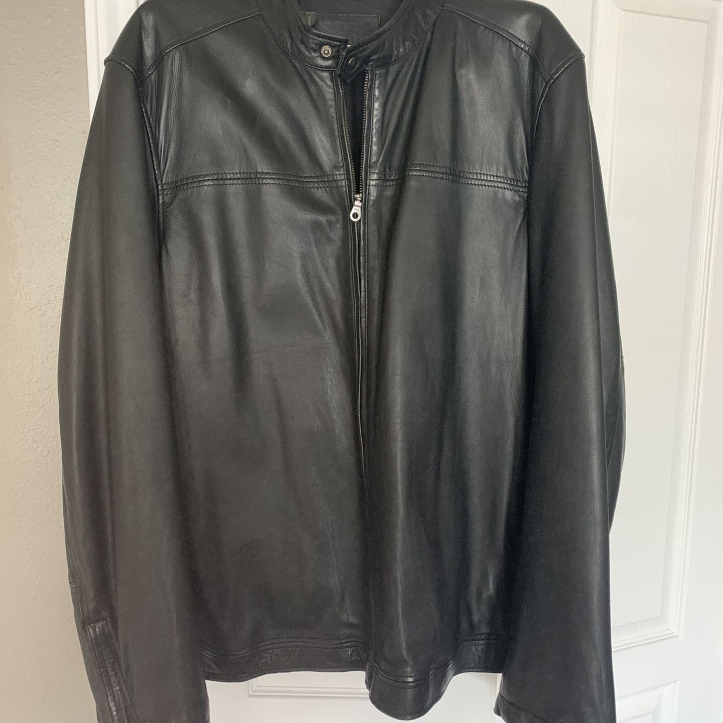 100% leather Jacket (biker style) shirt collar, Zipper cuffs. Never worn still looks very brand new. Let me know, thanks