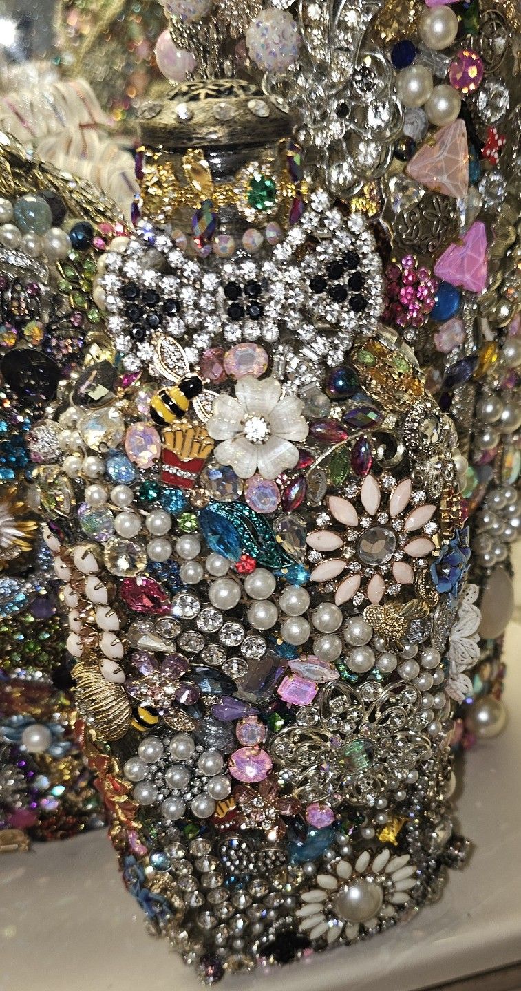 These are pieces of art and wonder! The amount of stones and many vintage pieces Encrusted on the surface will have you looking at it for hours! Perfect gifts for family members!! There are many more pieces not shown in the pictures. Available on request. The Large Bottle is selling $174.50 The Smaller piece is selling at $85.00 You can purchase BOTH this month ONLY on sale for the incredible price $160.00!!!! LADIES YOU NEED THESE IN YOUR HOME THEY GORGEOUS!!
