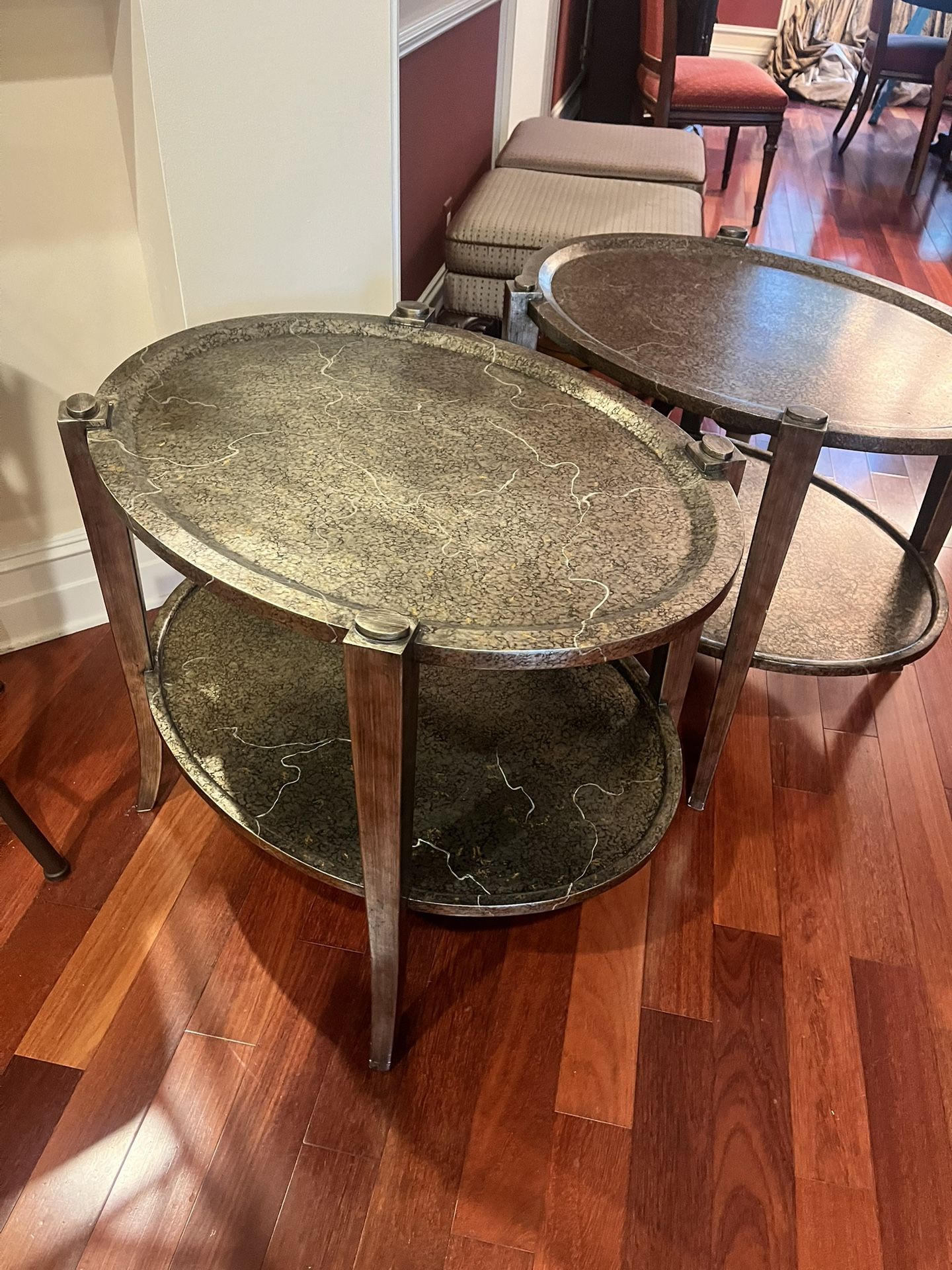 2 like new accent tables. Oval shaped 2 tiered. High end contemporary. $75 each or both $130 25 “ high Top 24x32 oval