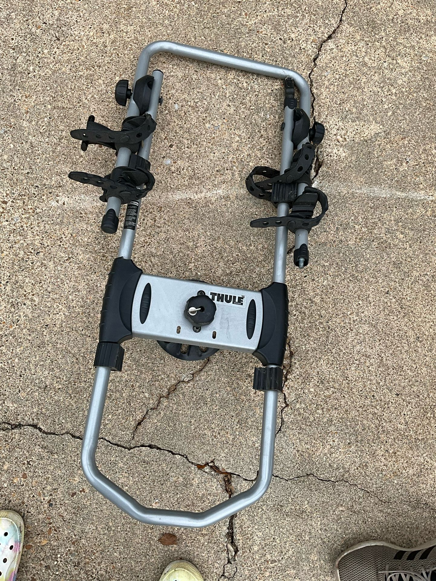Thule bike carrier with lock. Fits spare wheel on Jeeps but it doesn’t accommodate rear camera (sorry). Otherwise great bike carrier.