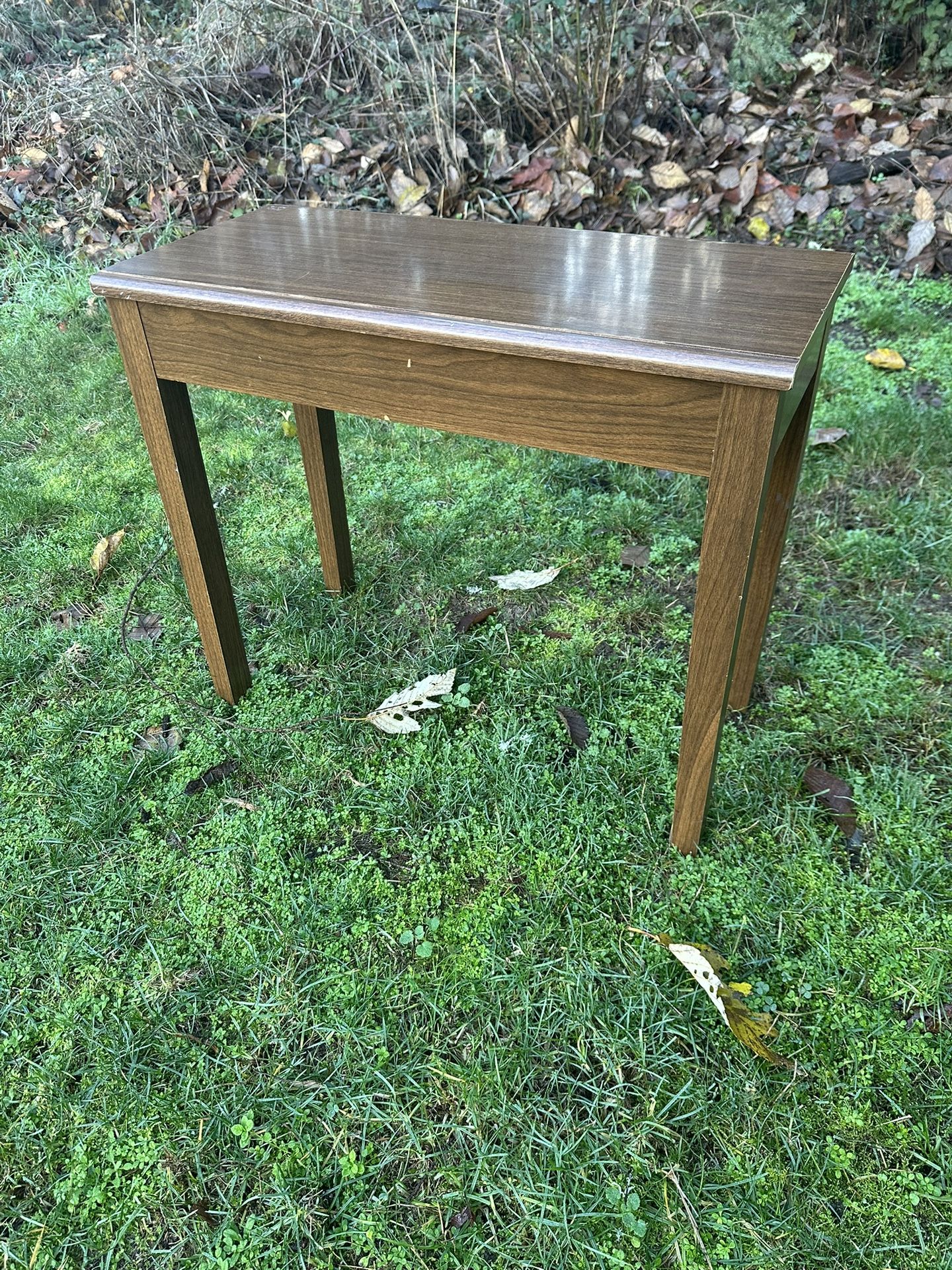 Small wooden side table in decent condition. Has some small scratches and one bigger scratch as shown in picture. Measurements are 26 inches long, 12.5 inches wide, and 22 inches tall. Thank you!!