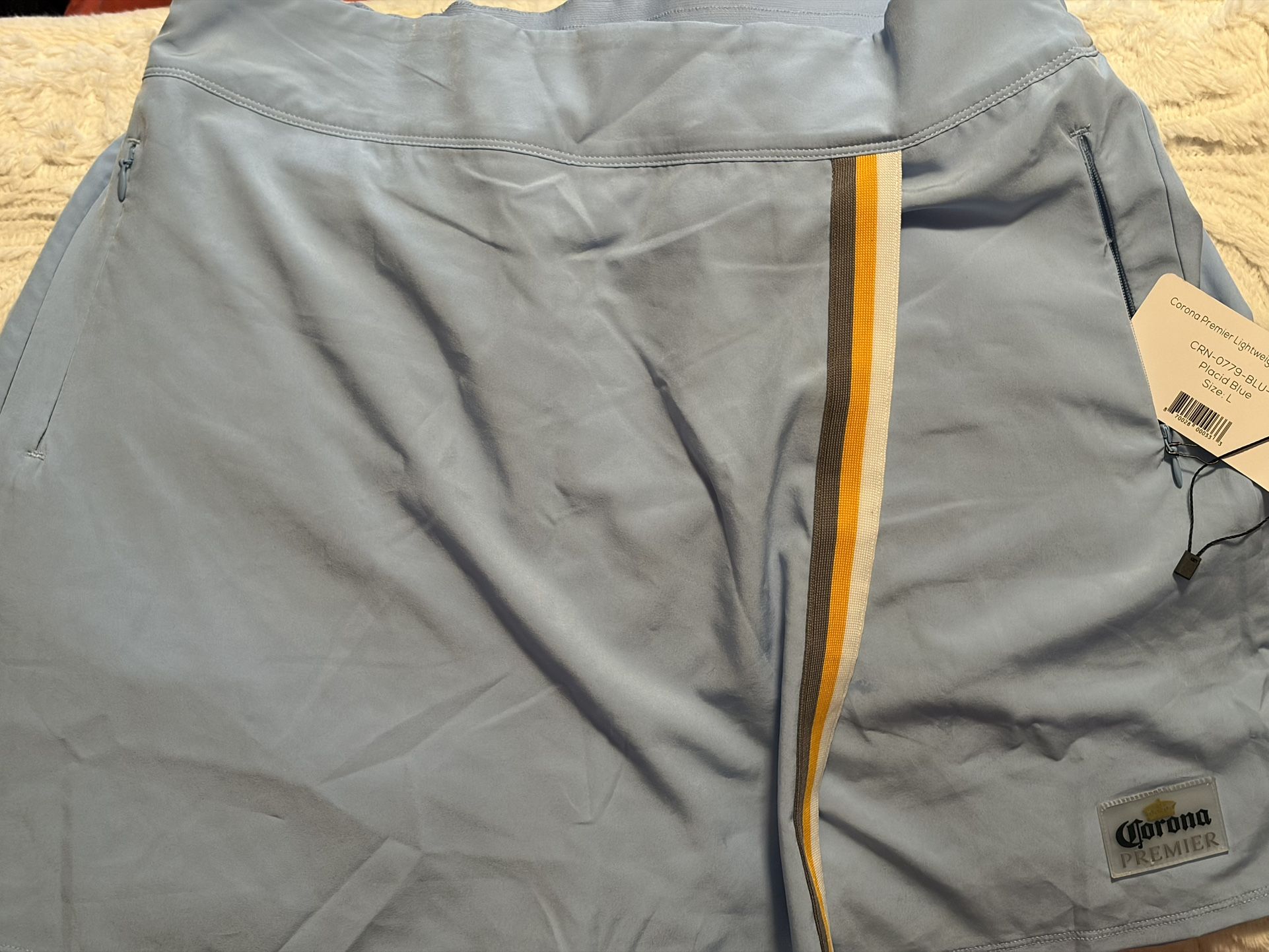 New corona premiere golf skirt with shorts connected. Placid blue with the original corona colors yellow and dark blue has two pockets in the front and one in the back very breathable for Golf and just a day out with the girls on the lake.