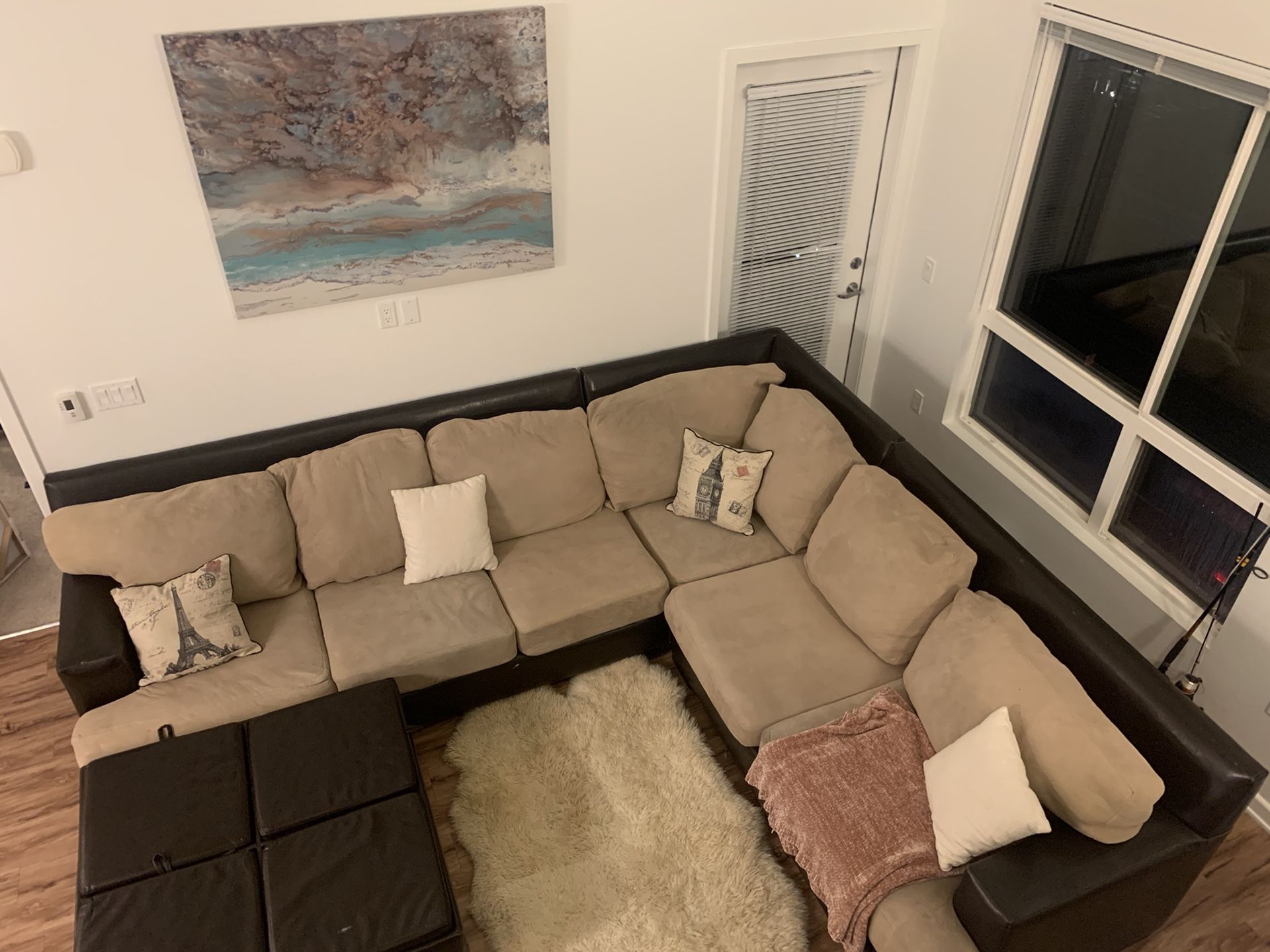 10’6” x 8’10” Costed $2500 a year ago. I never use and it’s too big for my place. Single guy who always works late. Sink right into this amazing comfortable and soft couch that can fit 6 people easily! Comfiest couch in America! Easily wash the pillows by taking their cover off and throwing them in the washing machine. This is a steal. Excellent cond.