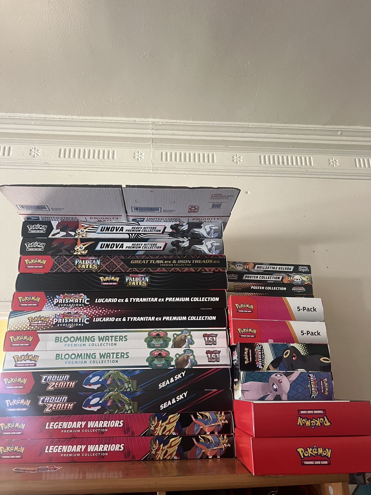 Selling my spare premium collection boxes . Selling at market price . All boxes are factory sealed. Willing and open to trade for booster boxes , Psa 10 slabs or other high end sealed . Will trade most of this for an evolving skies booster box. Or Willing to sell all for a lesser percentage. Located in east La