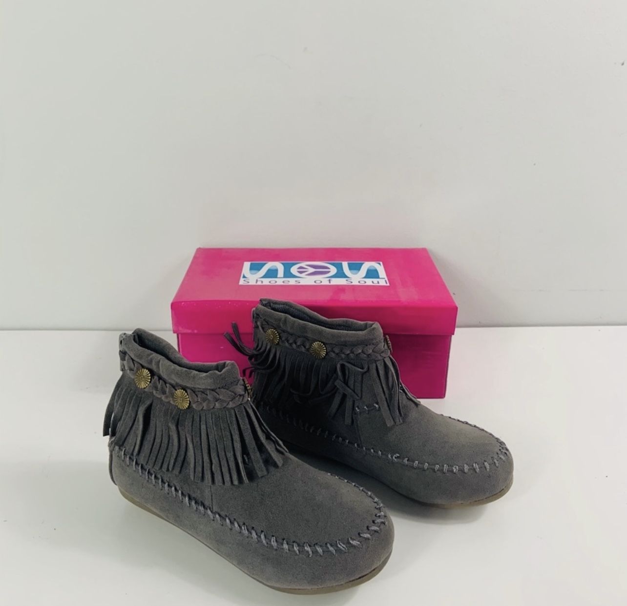 PRICE FIRM, pick up in Plainfield, IL or Minooka, IL or we can ship! Brand New Women’s Size 5 Gray Fringe Moccasin Booties Brand: Shoes of Soul Includes Box