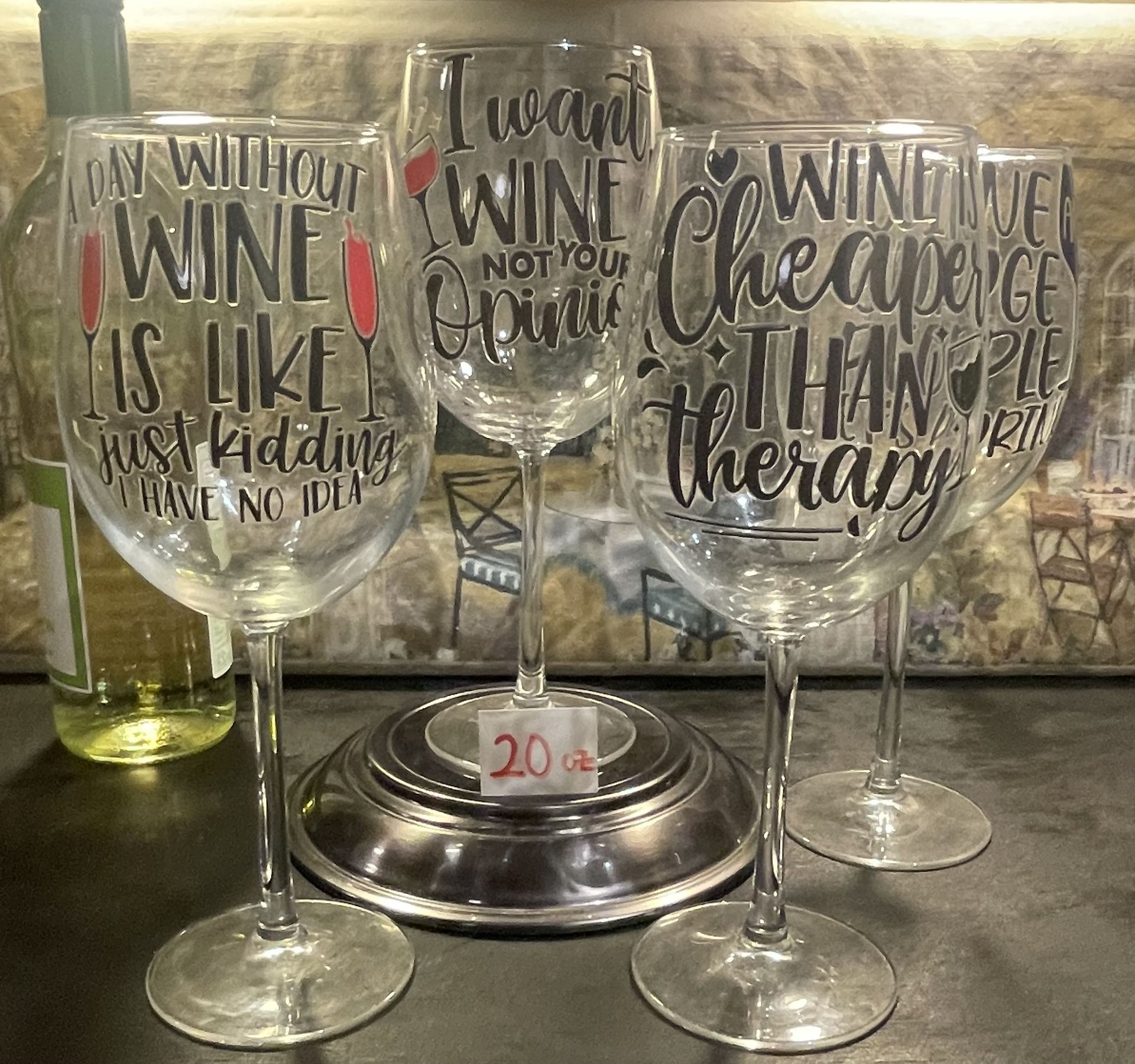 Long stem 20 oz . wine glasses with quotes on them. Set of 4 / $40.00. Located in Casa Grande off of Val Vista and Pinal. If you have time take a look at all my other items. You can get started on the Holiday shopping. 90% of my items are new. . Message me if interested. Thanks and have a blessed day.