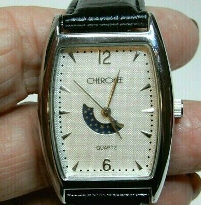 About this item Condition Pre-owned Bezel Color Silver Indices Non-Numeric Hour Marks Year Manufactured 1(contact info removed) Band/Strap Two-Piece Strap Case Color Silver Department Men Caseback Snap Watch Shape Tonneau/Barrel Style Casual, Dress/Formal Features 12-Hour Dial, Moon Phase Case Material base Metal + Steel Back, Stainless Steel Movement Quartz Brand Cherokee Type Wristwatch Band Color Black Band Material Leather Customized No Dial Color Silver Model 32-905