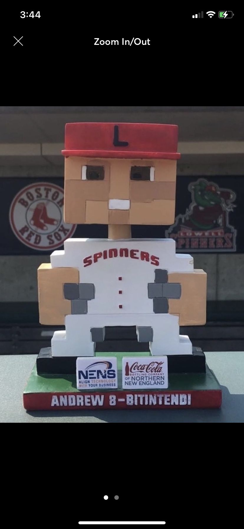 NEW LOWELL SPINNERS BOBBLEHEAD BENINTENDI ANDREW 8 BIT INTENDI 8/26/18 W BOX. Andrew Sebastian Benintendi (born July 6, 1994) is an American professional baseball outfielder for the Boston Red Sox of Major League Baseball (MLB). He played college baseball for the Arkansas Razorbacks of the University of Arkansas. The Red Sox selected Benintendi in the first round of the 2015 Major League Baseball draft. New in box bobblehead of Andrew Benintindi. Given out to first 1,000 fans at the Lowell Spinners game on 8/26/18