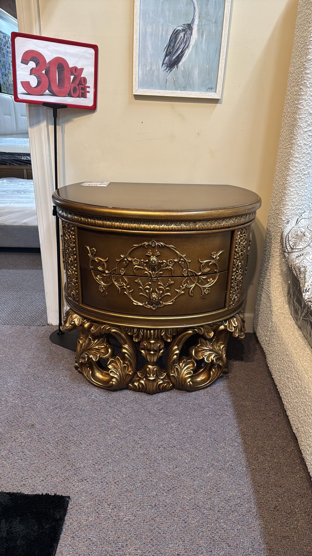 Give your bedroom that antique but elegance with this nightstand. Does have a little damage. Original price $1,159 Discounted price $199