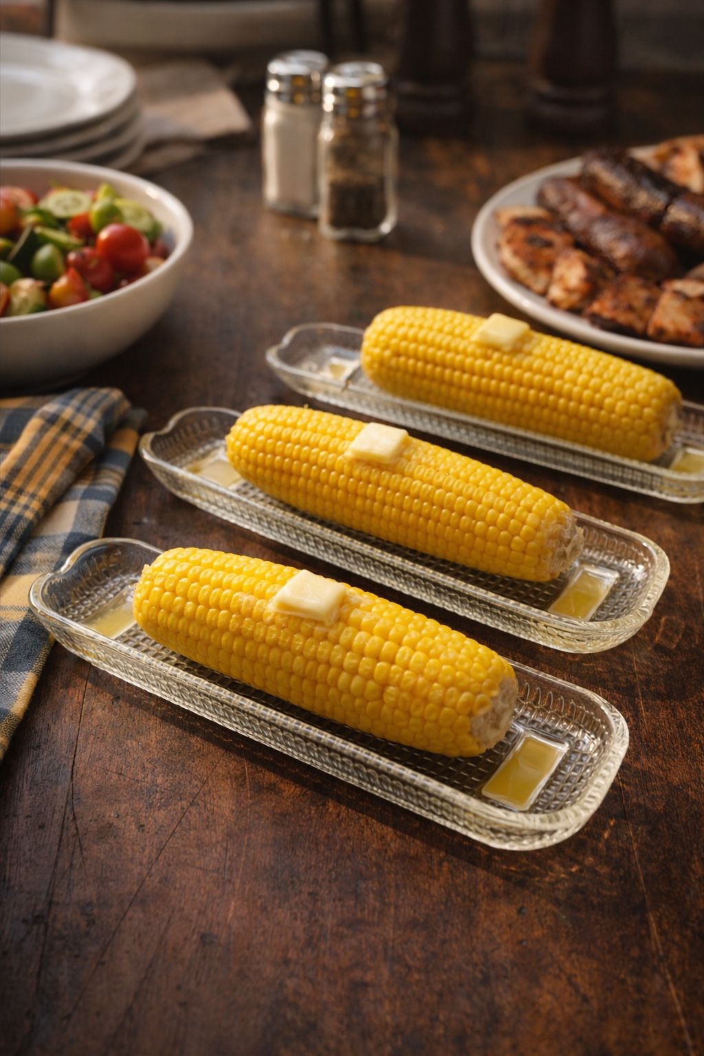 Vintage 1960s Set Of 3 Clear Pressed Glass Corn On The Cob Trays, 8.5x3” DAMAGED