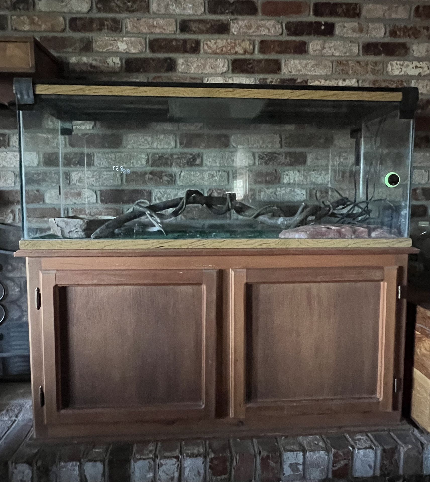 14” deep x 49” wide x 24” high 55 gallon fish tank used for ball python. No cracks or chips. Comes with everything in picture: tank, stand, light, screen top, heat rock, water bowl, climbing vine and thermostat.