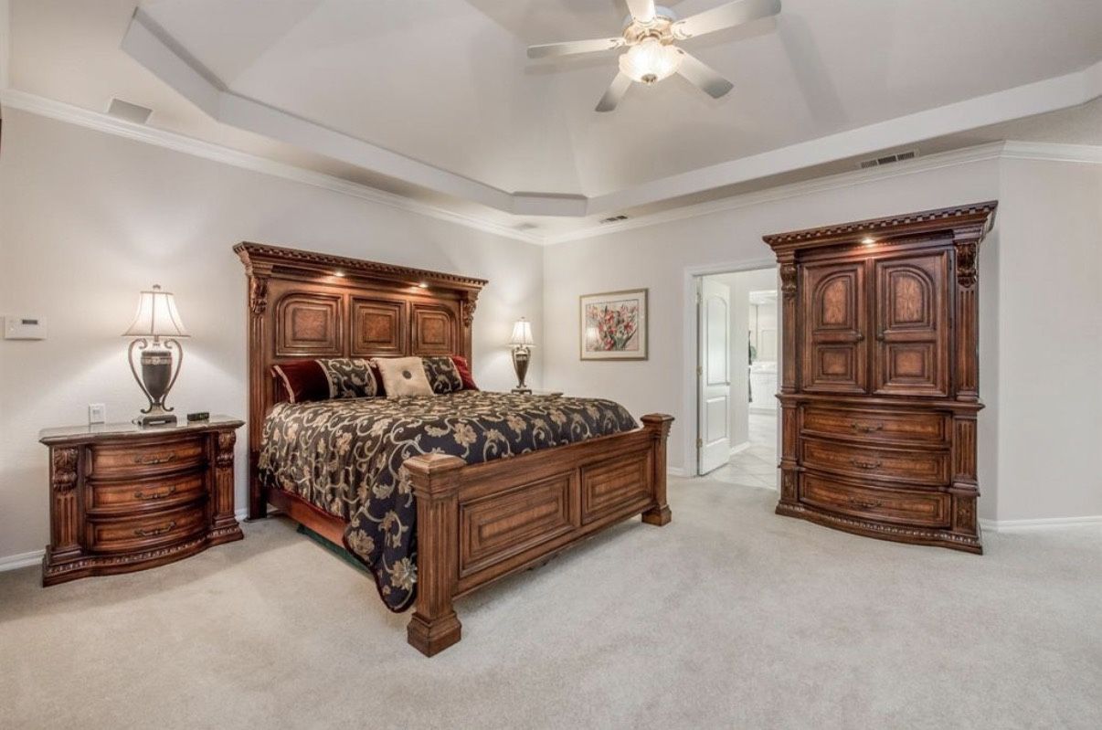 Solid wood King size bed with armoire, 8 drawer dresser, & 2 bedside 3-drawer tables King bed measurements: headboard-79” tall, 81” wide, footboard- 31” tall, 81” wide (2) Bedside tables: removable marble top, 37” long, 31” tall, drawer depth at deepest part 16” Dresser- marble top, 70” long, 39” tall, drawer depth at deepest part 17” Armoire measurements: 85” tall, 49” wide, 25” deep Fairmont designs is the maker