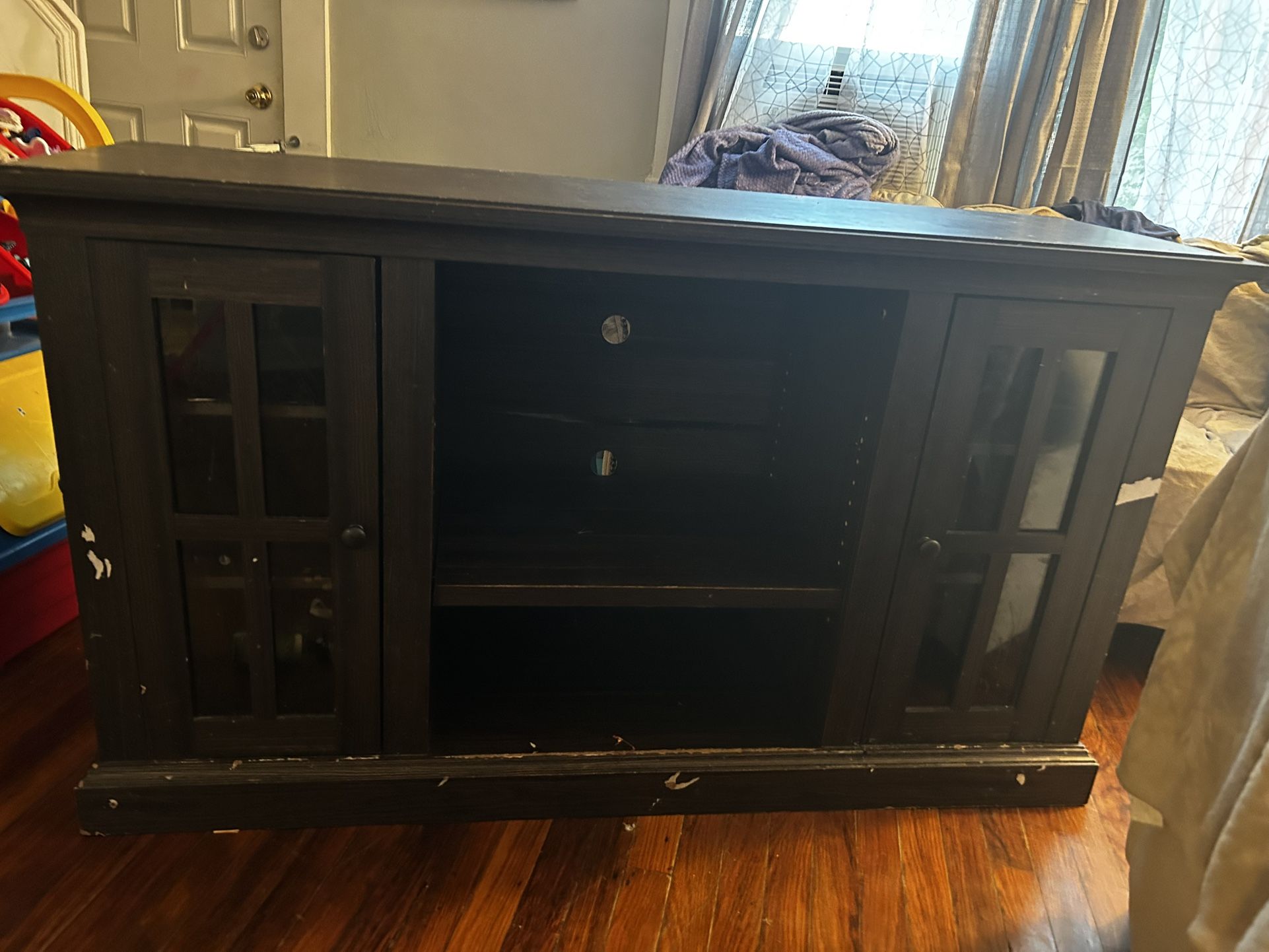 HEAVY wood tv stand entertainment stand for living room, has very obvious imperfections but can be fixed easily, must pick up in town of Tonawanda and have help. Need gone asap