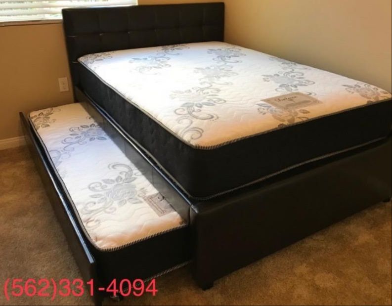 New boxed sealed trundle full/twin upholstered bed with both new mattresses included Opens on either side Delivery services $ COD Assembly $ Hablamos español