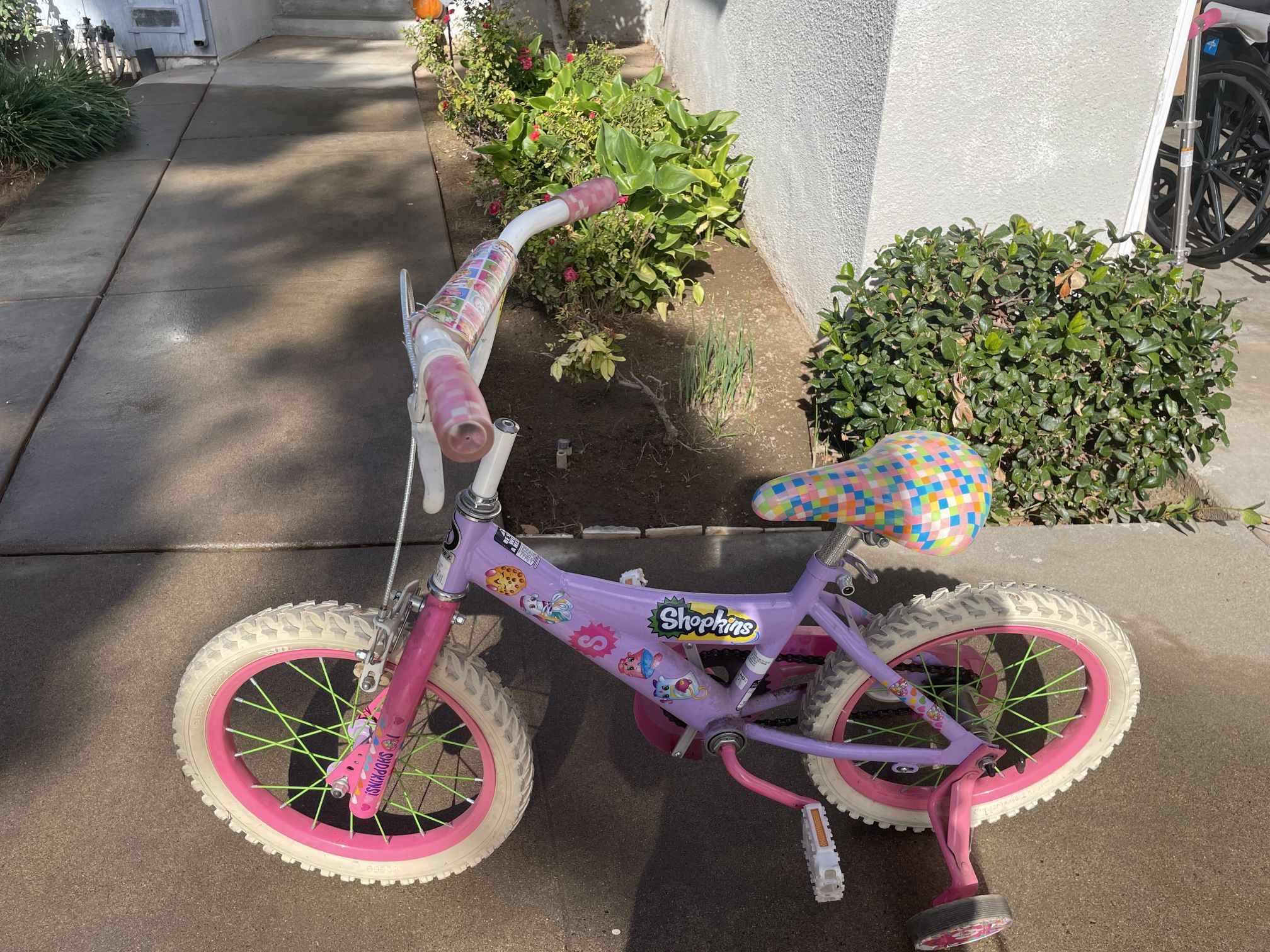 Girls Shopkins Dynacraft 16-inch Girls BMX Bike for Age Group 5-7 Years, Pink bike With training wheels Bought at Walmart for $110 plus tax ! Asking for $50 only! Price is Firm for serious buyers! Very clean used condition Used for a very short time