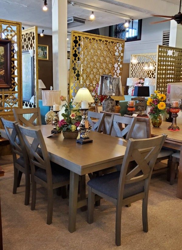 Gray Pedestal Dining Table + 6 Chairs