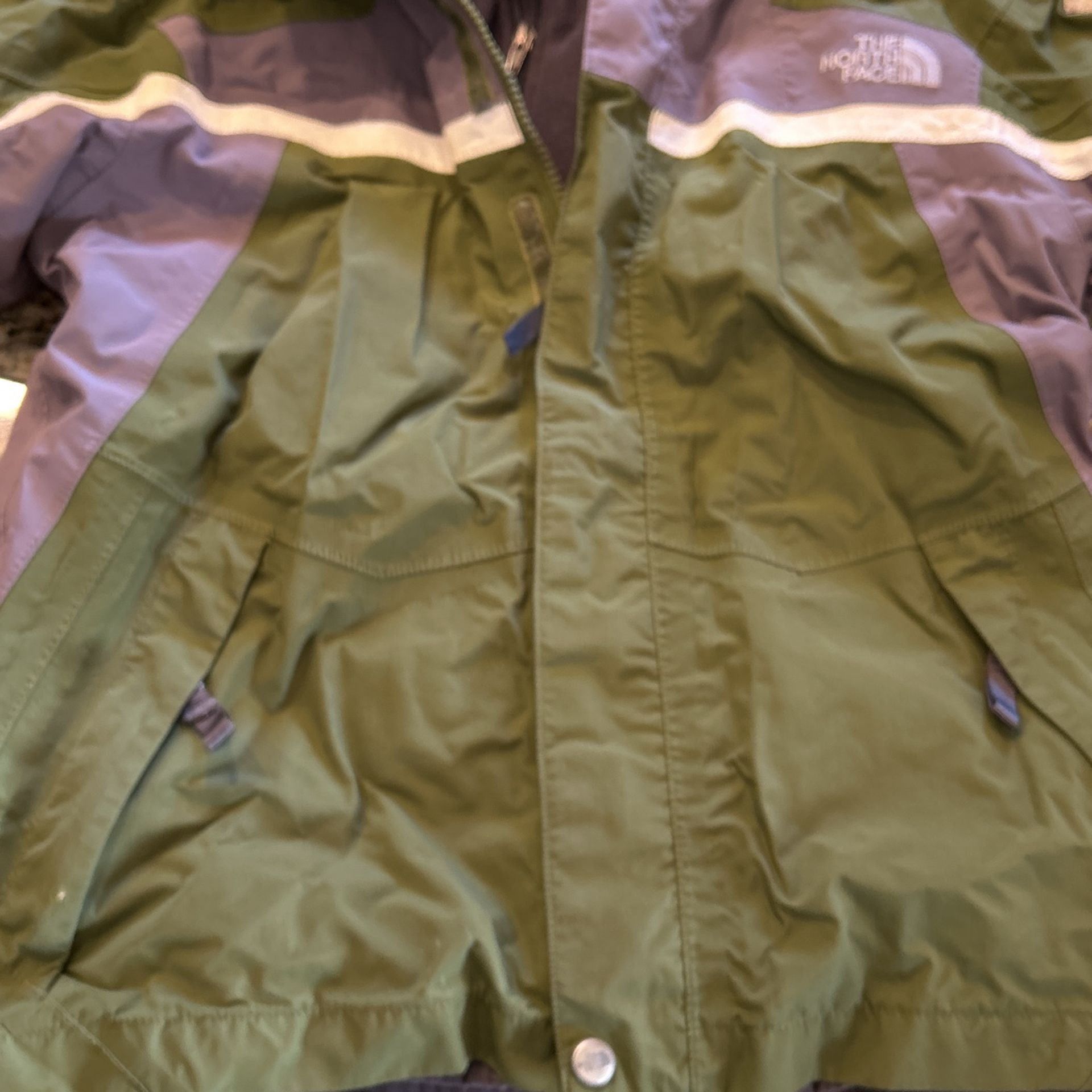 This is a great three-in-one jacket for the snow! My son wore it for snow play and also for snowboarding and kept him snug and warm. Has a zip out fleece jacket as an inner liner for an extra layer of warmth, or to wear on its own for warmer days. Outer shell is waterproof and can be worn on its own or with the fleece jacket tucked inside. North Face. Size boys large. For reference, my son was 13 when he wore this. Cross streets are the 101 and Frank Lloyd Wright in Scottsdale.