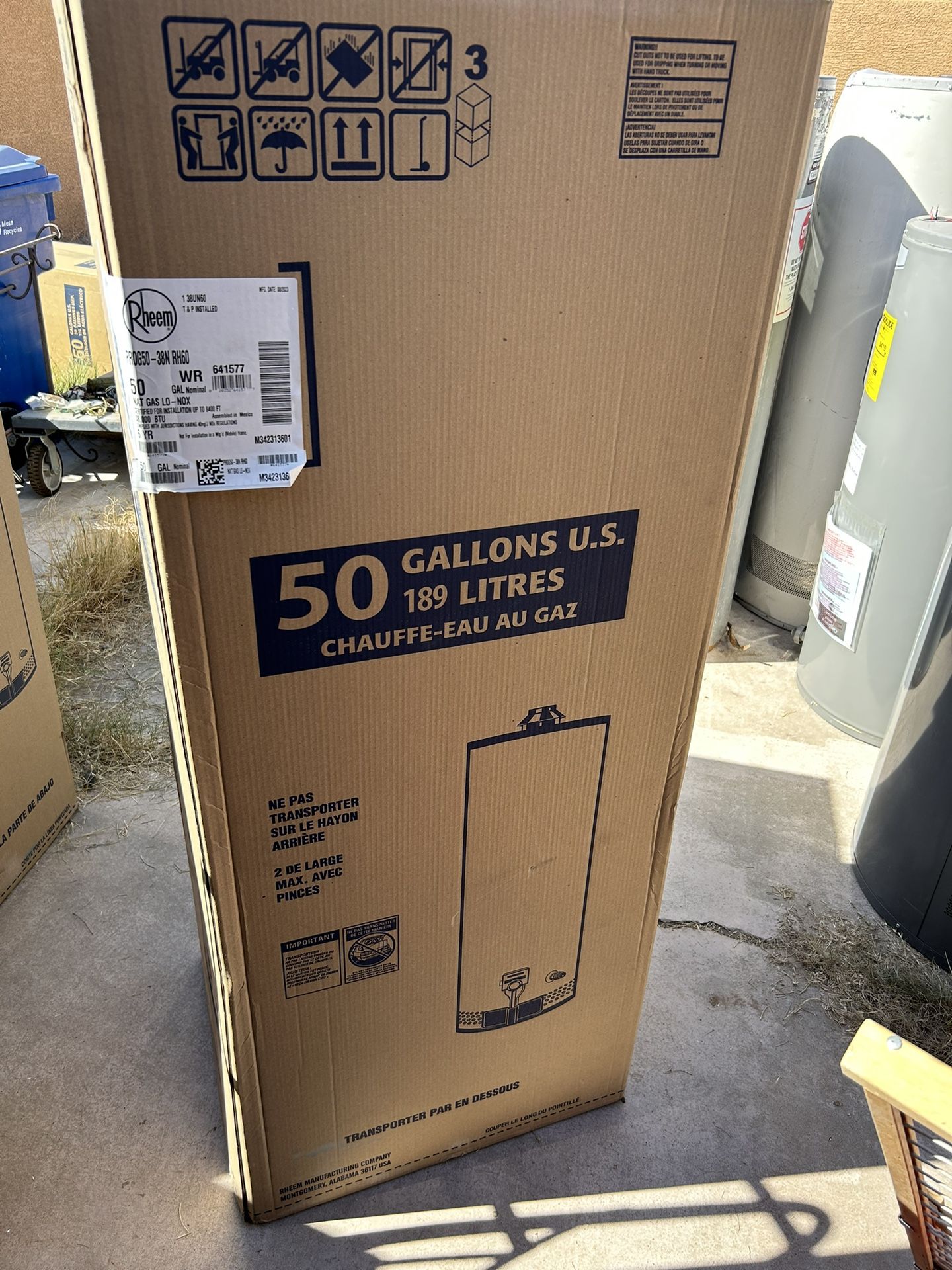 New in box 50 g gas Rheem water heater with 6 year warranty can install at additional cost would be installed by a professional plumber not a joe blow