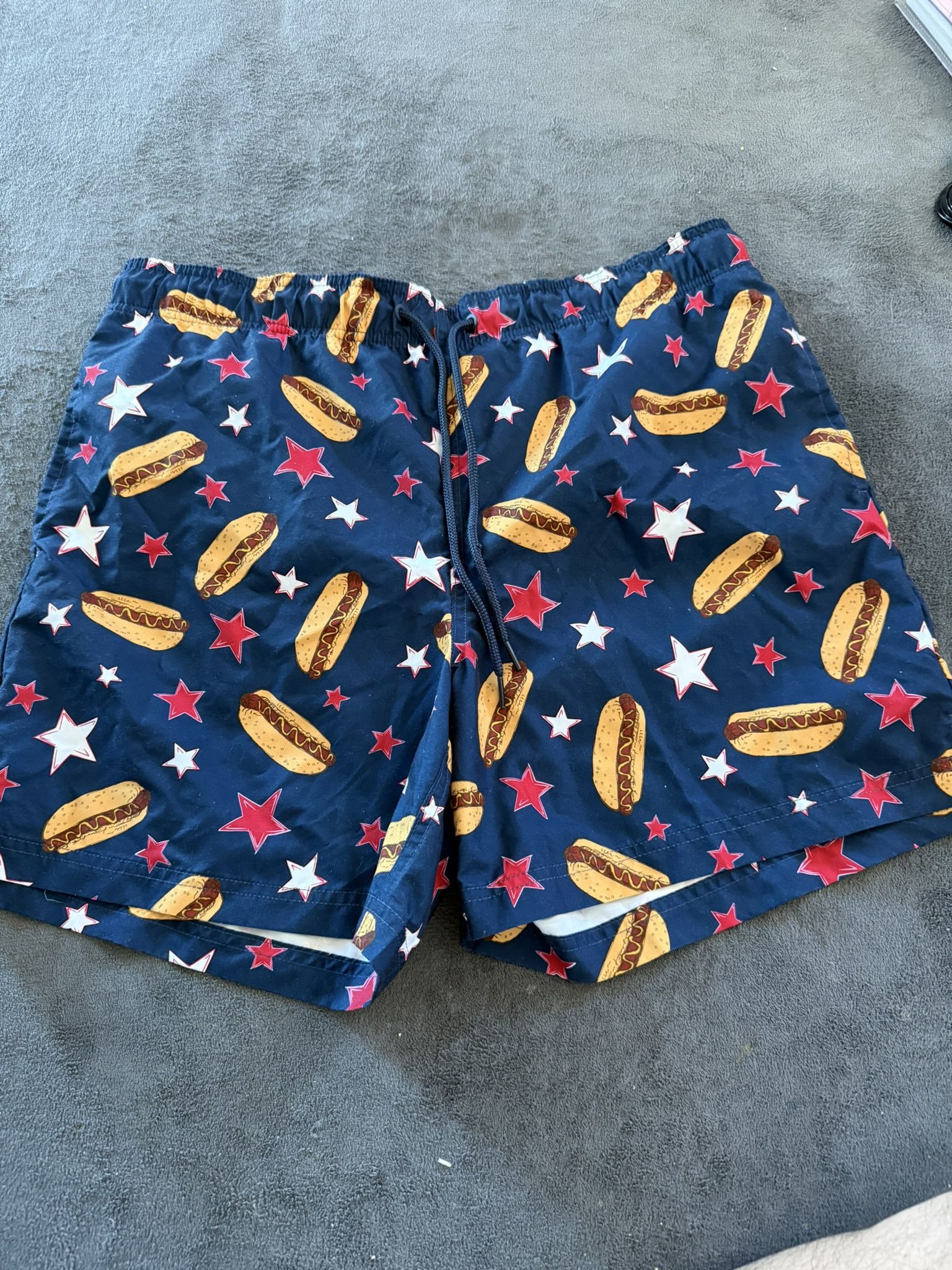 Navy blue shorts with hot dog and star pattern. Has drawstring waist and mesh lining. Made of 100% polyester. Size Large, fits waist 36-38 inches.