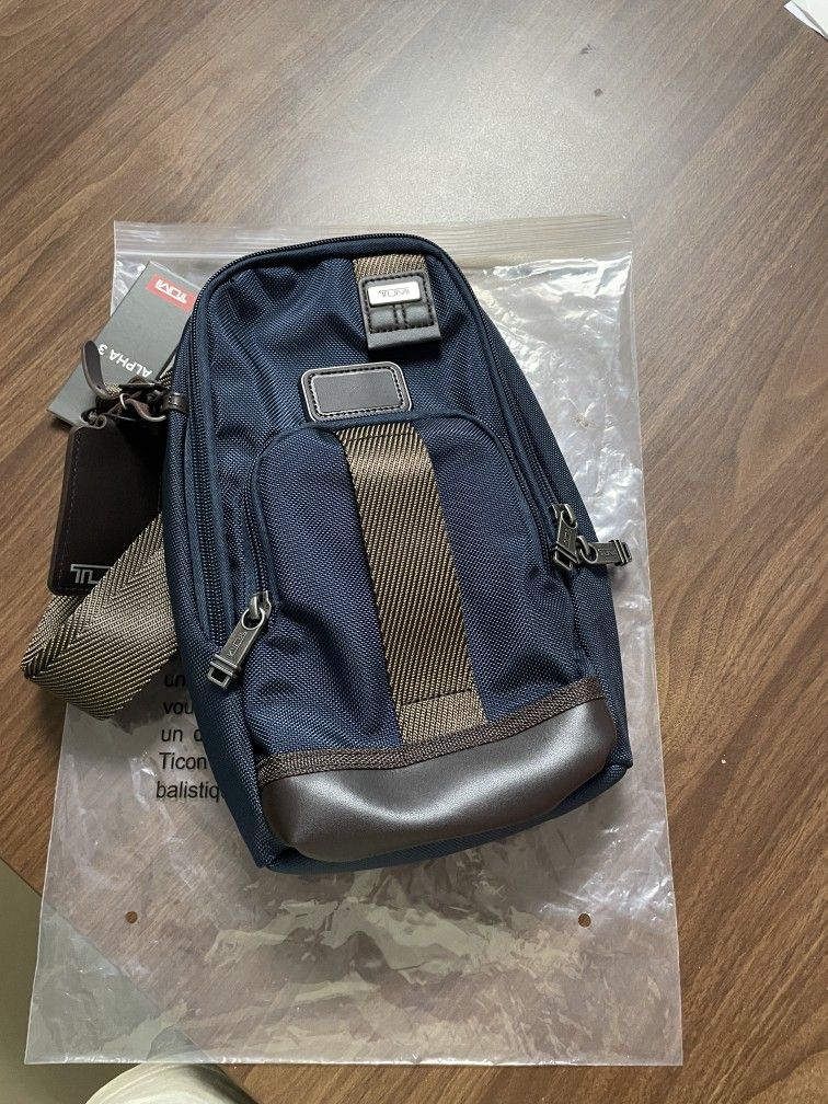 TUMI SLING BAG In blue Totally new. Never worn BAG Size:L8.5'' X W2.5'' X H12''. The strip length:30-50'' can be adjustment by self