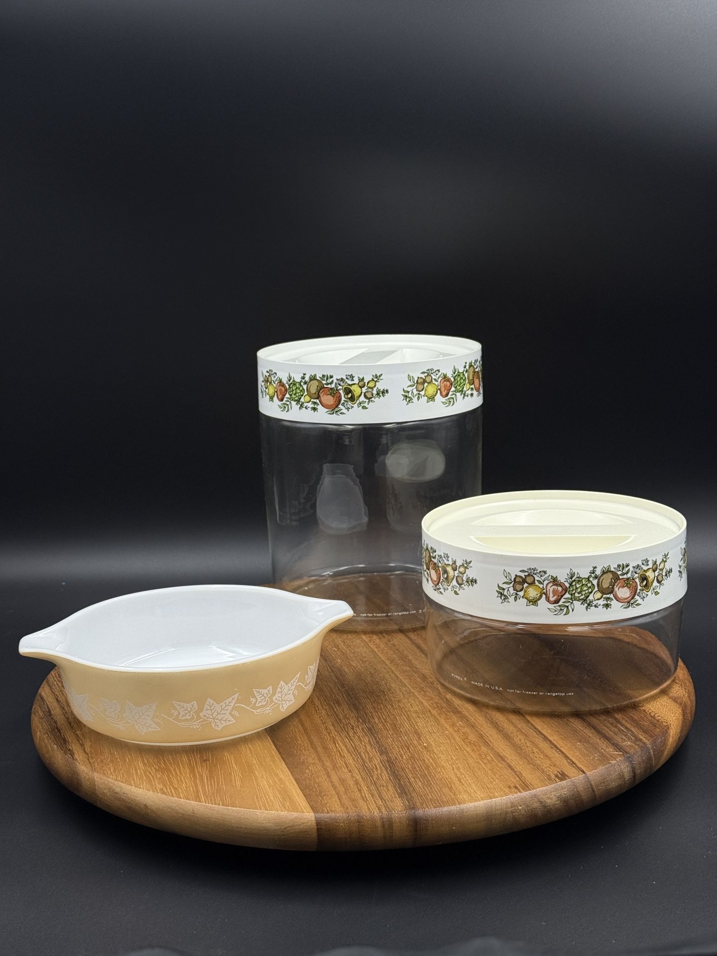 1960/70’s spice of life store and see canisters great condition Lid on small one is a bit discolored. One plastic seal in great condition included One canister does not have interchangeable plastic seal. Price reflects. Lid still closes if seal is not on. Makes either container airtight. Little 7” fall ivy santadwood beige mini baking oven safe dish All containers are oven safe without the lids Great condition vintage kitchen ware