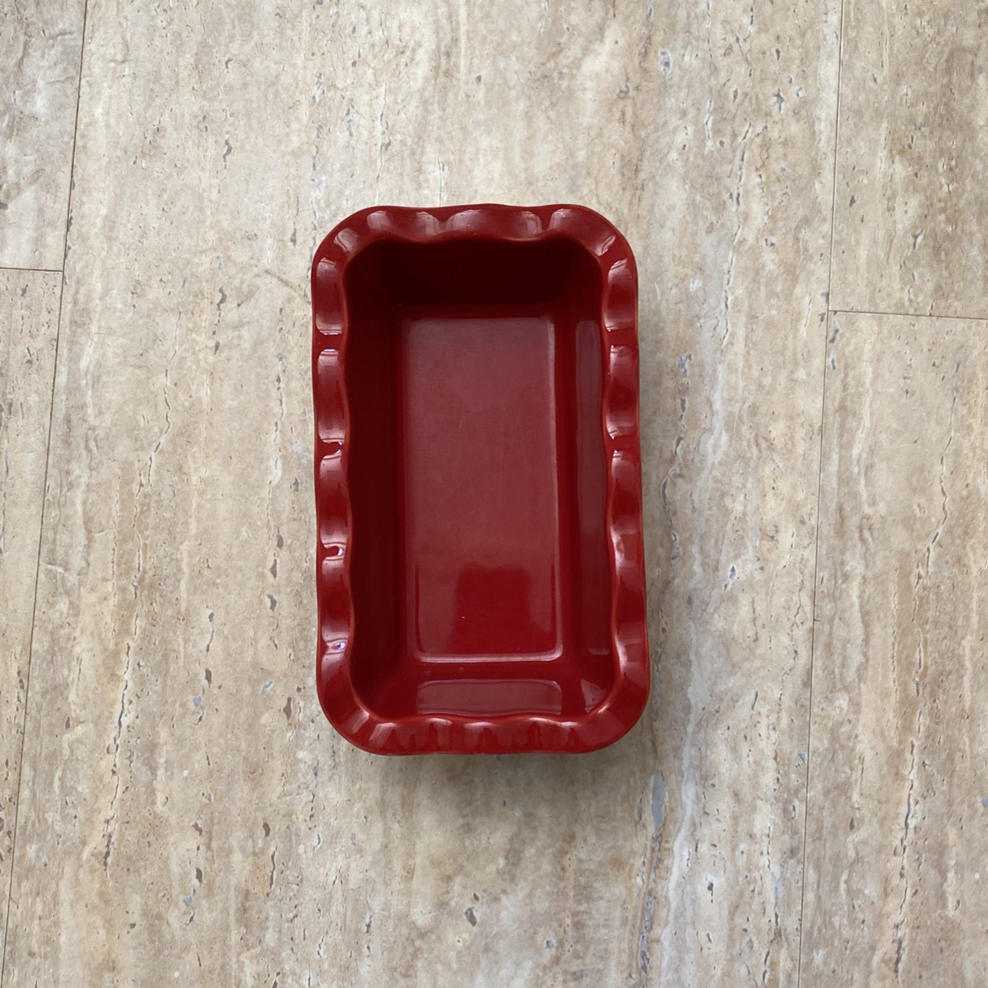 Emile Henry French Ceramic Ruffled Rectangular Baker Mini Pie Dish This Emile Henry ruffled baker is shaped from Burgundian clay, which absorbs, distributes and retains heat evenly, so gratins, casseroles and lasagnas brown to perfection. Inspired by vintage French bakeware, the graceful ruffled edge on the dish is based on a century-old ceramist's technique – updated to simplify cutting and removing a tidy portion. Burgundian clay heats evenly for gentle, uniform baking and browning. Ceramic retains heat exceptionally well to keep food warm at the table. Ruffled edge modeled after the company's handcrafted classics from the early 1900s. Vibrant exterior for a beautiful oven-to-table presentation. Durable, hand-applied glaze will not chip, crack or craze over time. Will not absorb odors or flavors. Microwavable; oven, freezer, broiler and dishwasher safe. Handcrafted in France.