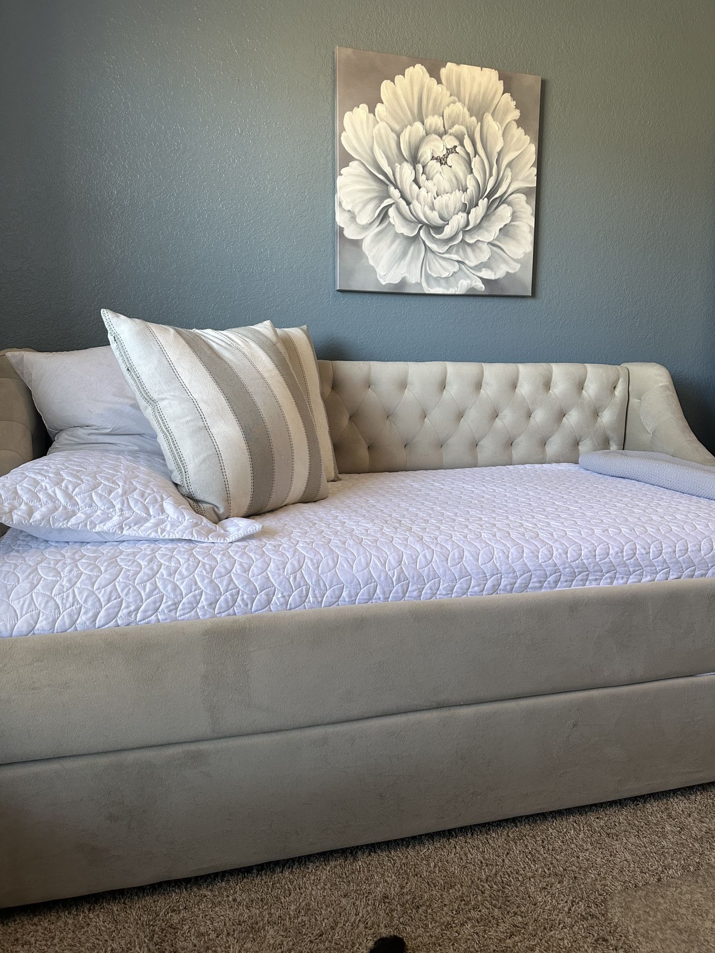 Upholstered day bed. It has an XL twin on the top and a regular twin on the bottom. It’s barely even been sat on. It includes all the bedding. None of its been used.