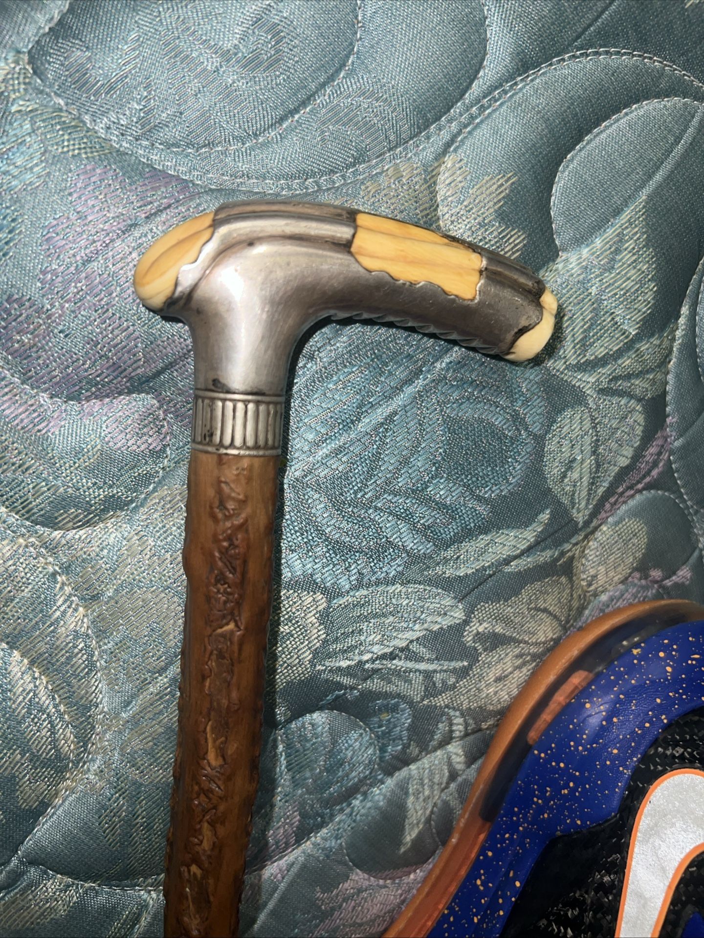 This exquisite antique walking cane features a finely crafted sterling silver handle, hallmarked 'GORHAM STERLING 366'. The handle is adorned with a carved ivory shell-form cap, exhibiting natural age-appropriate crazing and patina. The shaft is composed of richly textured, natural hardwood-possibly Malacca or briar root-with a rustic, bark-like surface. Estimated to date from the early 1900s, this piece was likely a high-end gentleman's accessory. It combines premium materials with elegant craftsmanship, making it highly collectible among antique cane enthusiasts and silver collectors. Dimensions (approx.): - Full Length: 34 inches (from tip of cane to end of silver handle) Condition: Very good antique condition. Minor ivory crazing. No structural damage Asking 750 obo