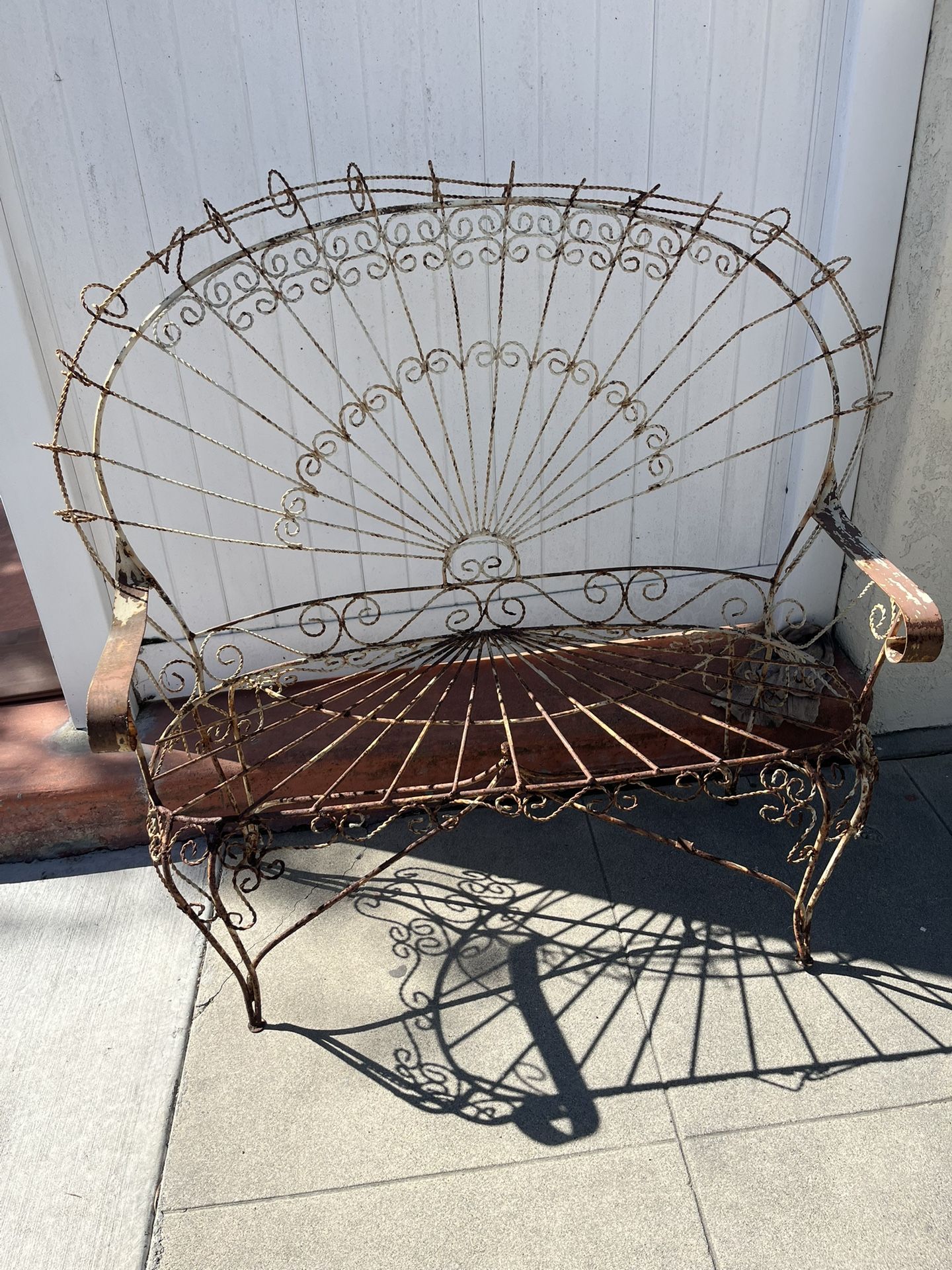 Stunning vintage Hollywood Regency Mid-Century wrought iron fan back peacock settee attributed to John Salterini. Gorgeous and delicate filigree makes it a standout piece for a garden or patio. Want your very own Cathy & Heathcliff moment? This is the perfect bench to fan yourself off on whilst draped over the exquisite wrought iron arm. Ready your corsets ladies cause this baby will deliver. (I don’t deliver though, pickup only.) Make me an offer!