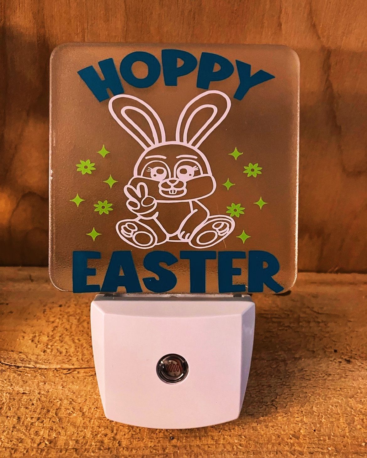 Hoppy Easter led plug in nightlight Has white sensor light and will turn on when dark. Colorful vinyl graphics.