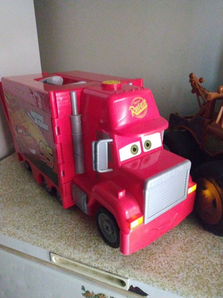 Mac opens up and Lightning McQueen is in there with a car lift that goes up and down, Lightning McQueen lights up eyes move and goes by itself, Towmader talks and moves by himself, McQueen and Towmader are huge cars, and they come with the Batteries. Thanks for viewing and check out my other items