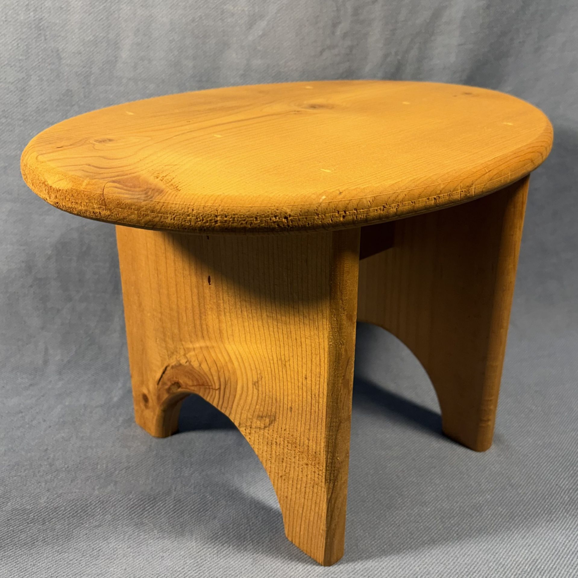 Vintage Scandinavian modern stool, likely crafted from solid pine wood in Sweden. Sculptural minimalist style commonly produced during the 1960s and 1970s. Oval top with curved sculptural legs. 13.5 x 10 x 9 inches. In excellent condition. Can be used as seating for a child, plant stand, riser or tiny side table in modern interiors.