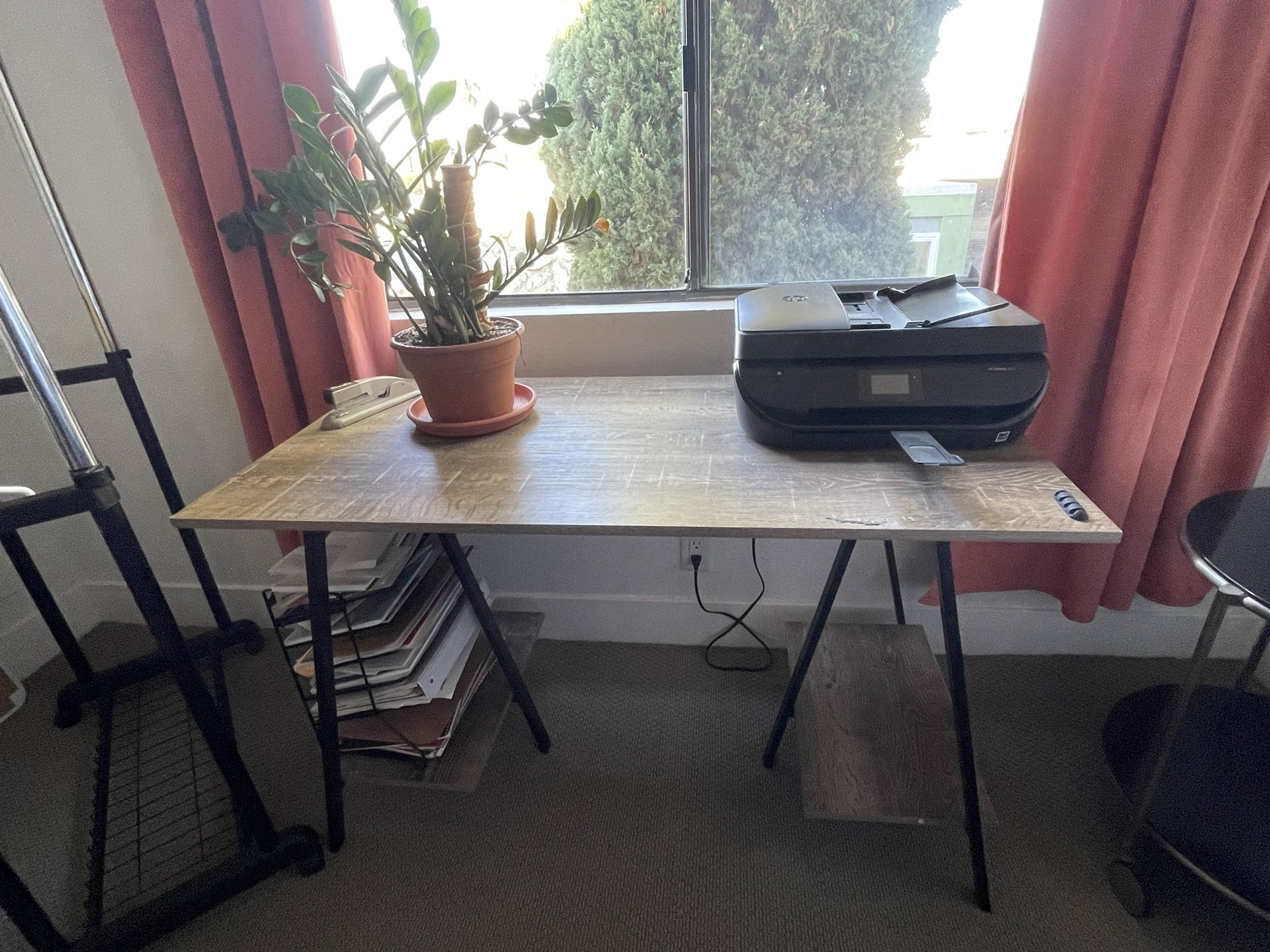 No longer have a household with two people working from home so I’m getting rid of one of our desks! It does have a minor scratch in the corner and a spot where part of a mousepad stuck to it that you’d need to take care of, but other than that it’s very elegant and in perfect condition. 47in L, 23.5 W, 29 H