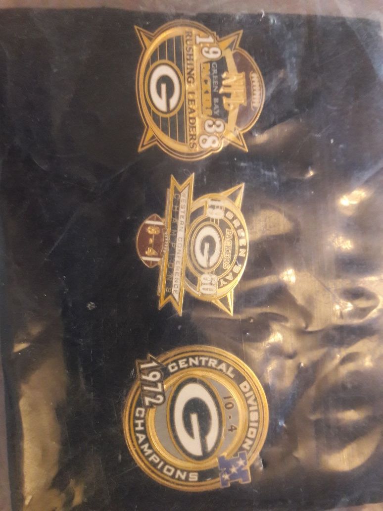 I am selling Green Bay Packer championship pins made by the Bradford Exchange. They were made in approximately two thousand four. They come in sets of three. I have three different sets of three, plus one duplicate. I am asking $15 per set. They are selling on eBay when you can find them for $30 per pin. Thank you for looking!