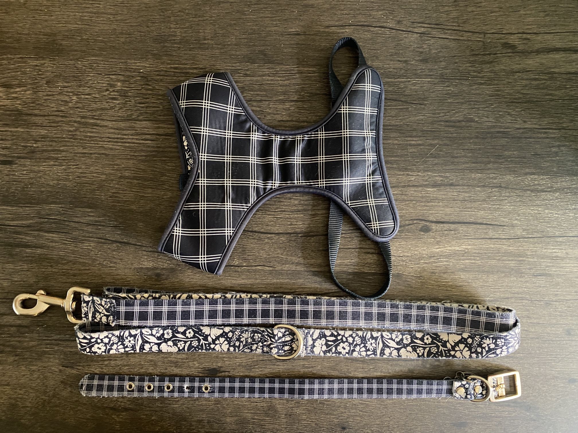 Bond & Co Reversible Blue/White Floral/Plaid doggie set. You can put the blue and white flowers or switch it up the blue and white plaid. Super cute and got lots of compliments, but I upgraded to a personalized set. ππΎ Includes: β Small Dog Collar - 12-15β β Medium Dog Harness - Chest 16-24" β 6ft Lead or Leash $5 Checkout my other dog care items ππΎ