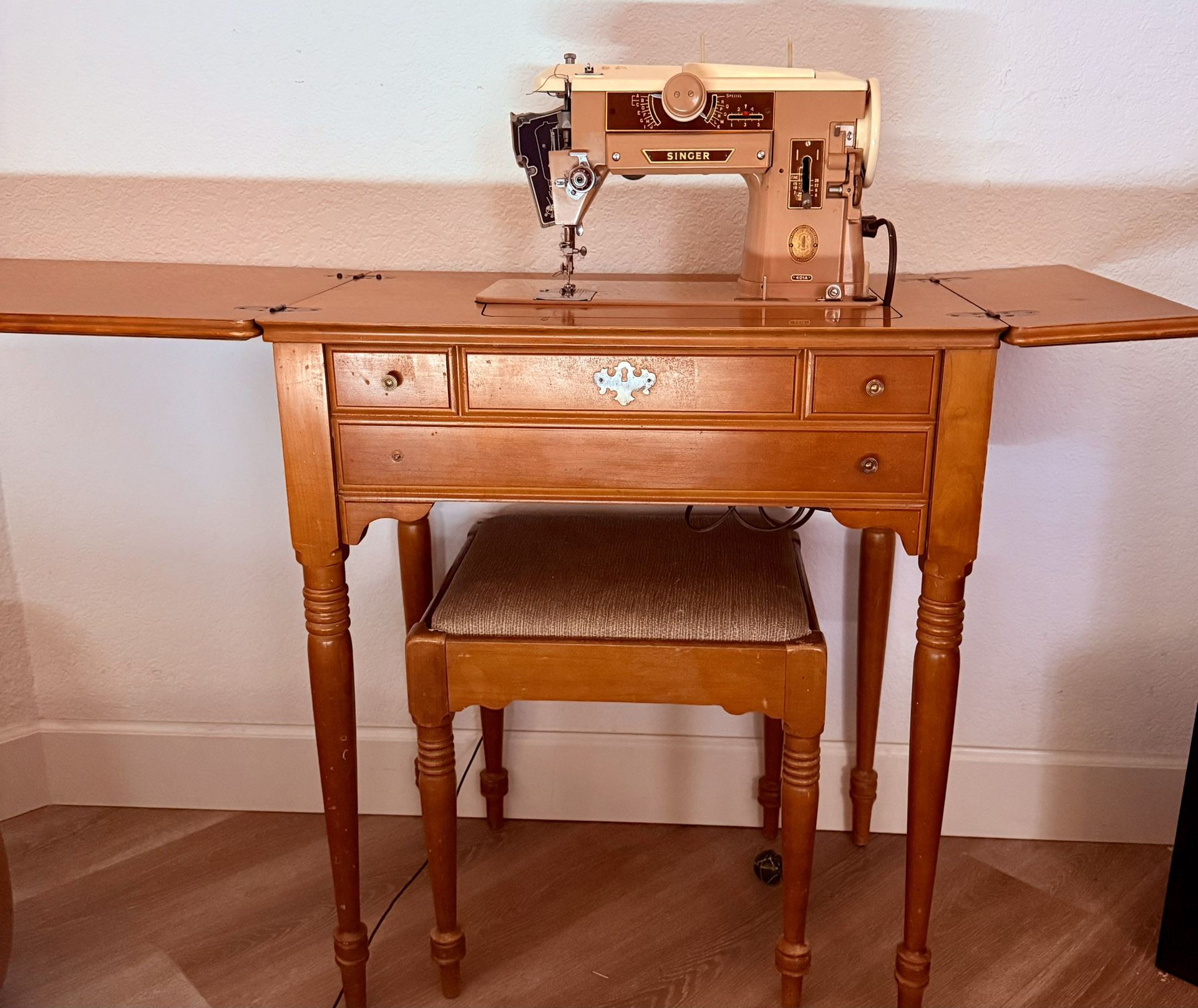 SINGER SEWING MACHINE 401A COMES WITH ORIGINAL SINGER TABLE & STOOL EXCELLENT CONDITION & TESTED $99 Free delivery before 4pm today Sunday