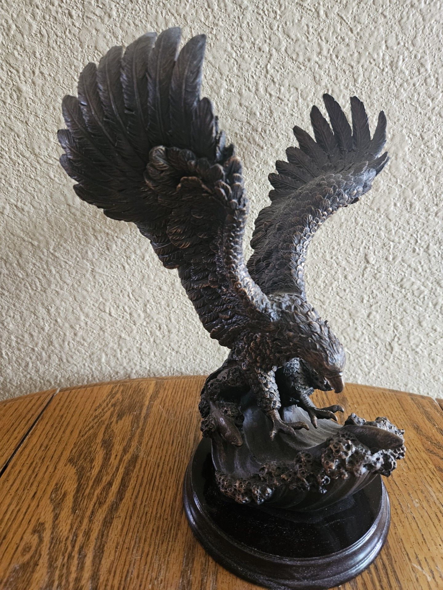 Beautiful Bronze sculpture of eagle swooping to catch a fish in the surface. On wood base. Excellent condition! The detail is exquisite. 11" tall, 8" wide, and 7.5" deep.