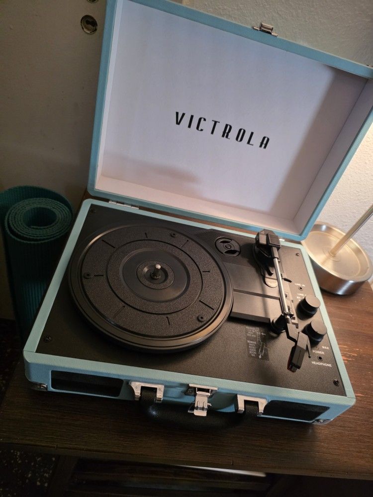 Baby Blue Victorola Vinyl Player. In excellemt condition mostly used as display for shelf.