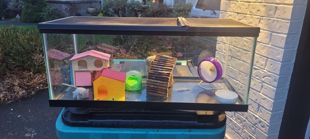 Slightly used glass hamster cage. Twenty gallon, flexible wood bridge, Hay tunnel, glass food and water bowl, Hamster wheel. Bathe station
