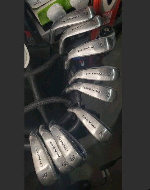 Elevate your golf game with this Mazel right-handed 9-piece golf club set, including irons 4 through 9, pitching wedge, approach wedge, and sand wedge. These clubs feature a blade-shaped stainless steel head and a steel shaft with a single weight for optimal swing performance. Perfect for golf enthusiasts, this set by Mazel boasts a classic design suitable for players of all skill levels. Personalize it with your own grip and hit the course ready to impress. Pre-owned and fairly used. Overall in great condition. Does come with a few scratches and blemishes