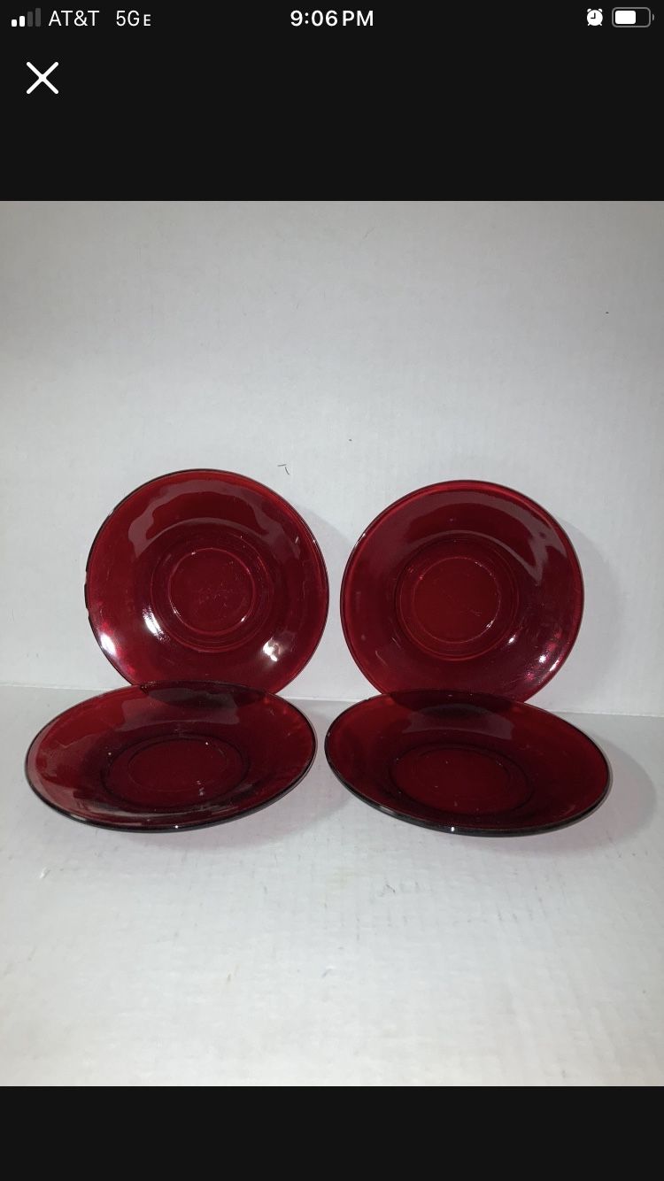 4 Anchor Hocking vintage saucers. Royal Ruby red. 5-3/4”. 2 have small chips on rim. Good condition. Asking $7. Pick up in Glendale Heights. Check out my other posts please