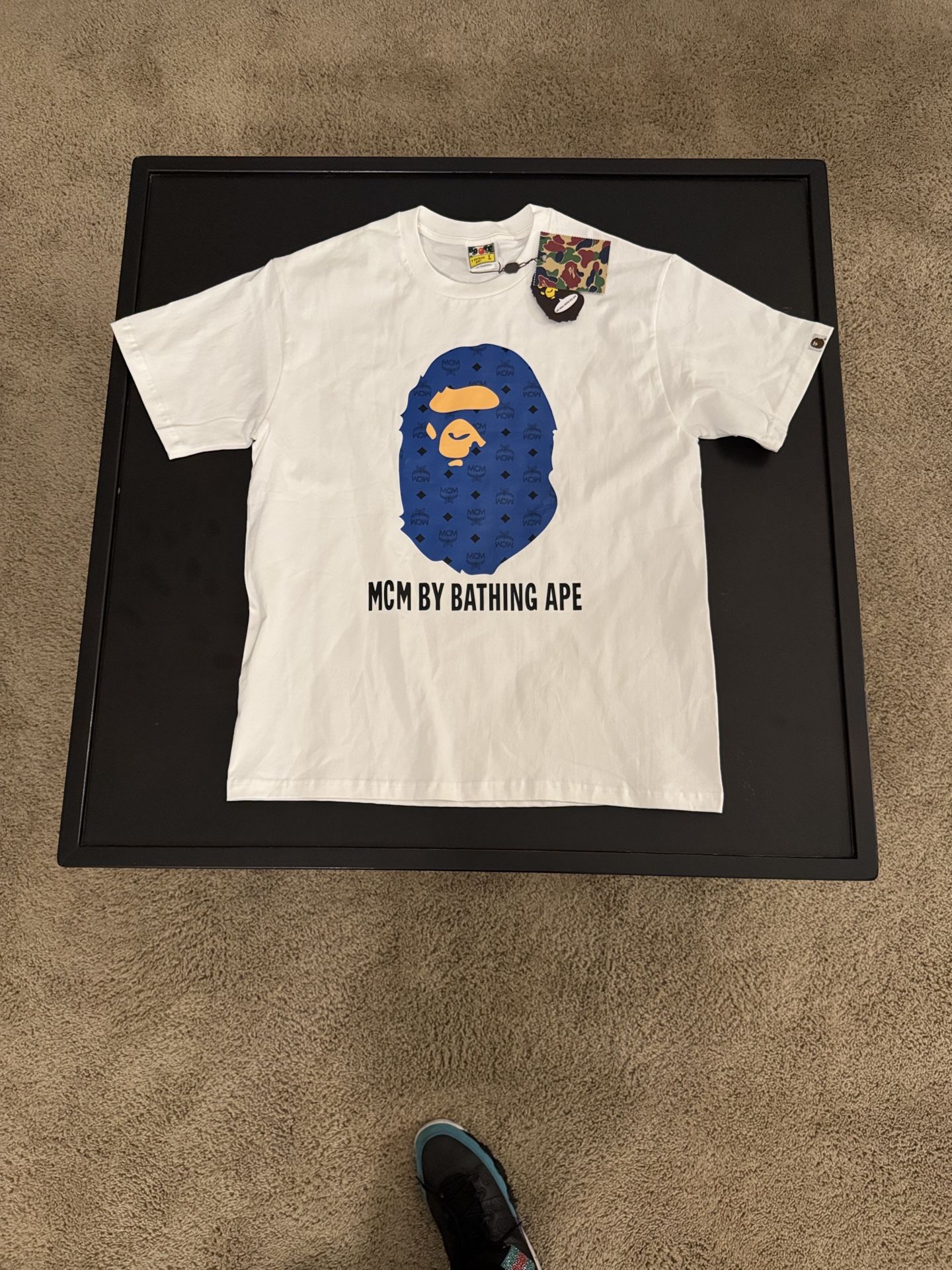 White short sleeve tee. Features blue and orange ape logo. Bold 'MCM BY BATHING APE' text. Size: Large and Extra Large available Condition: new Thank you for looking
